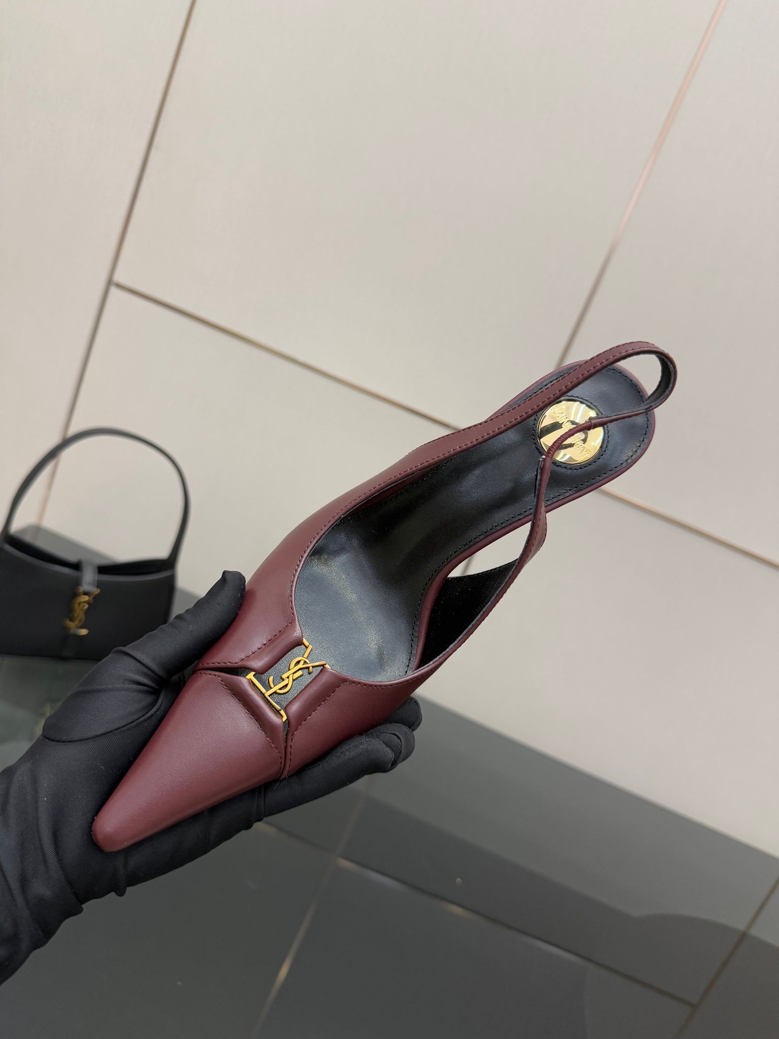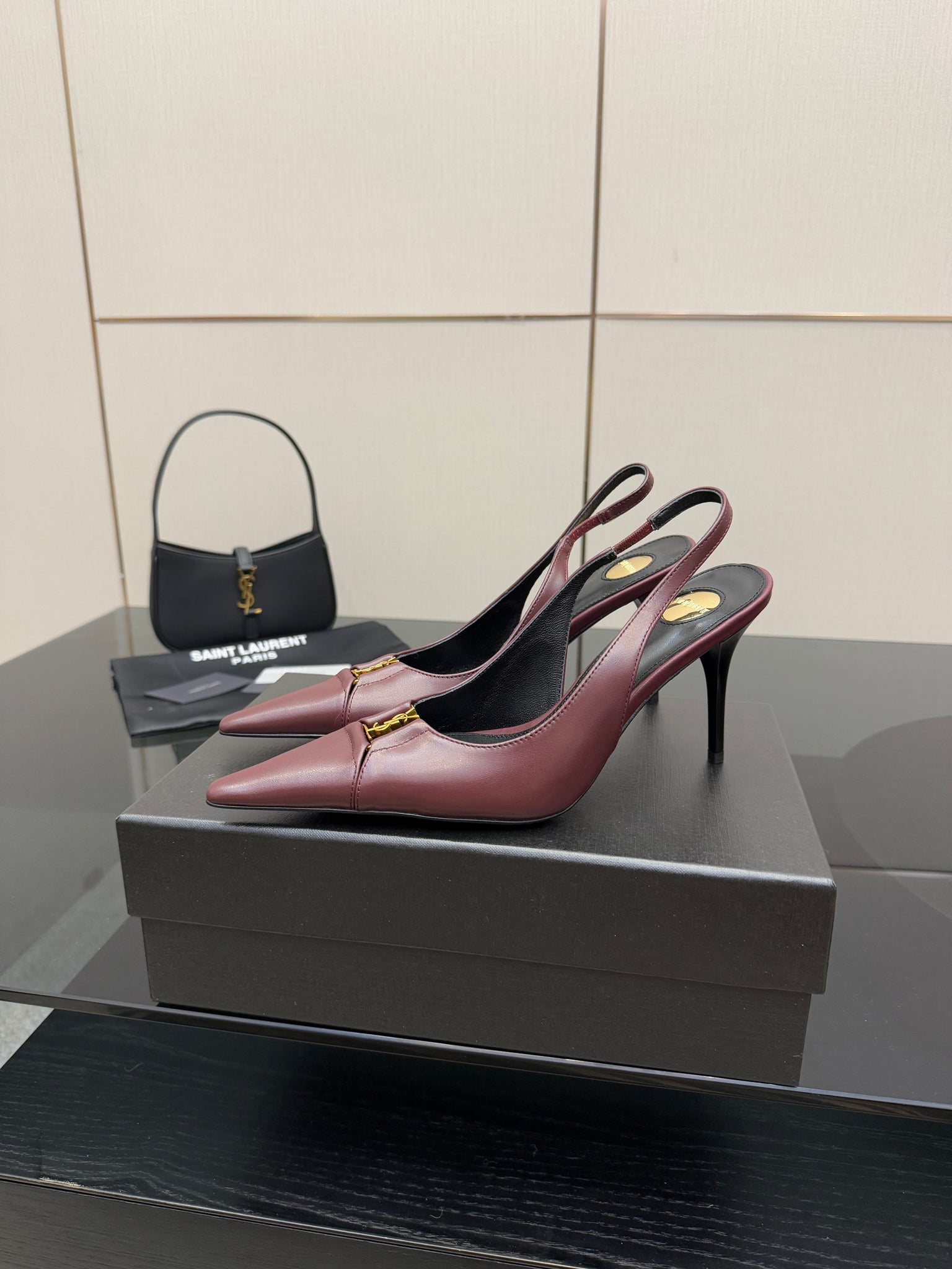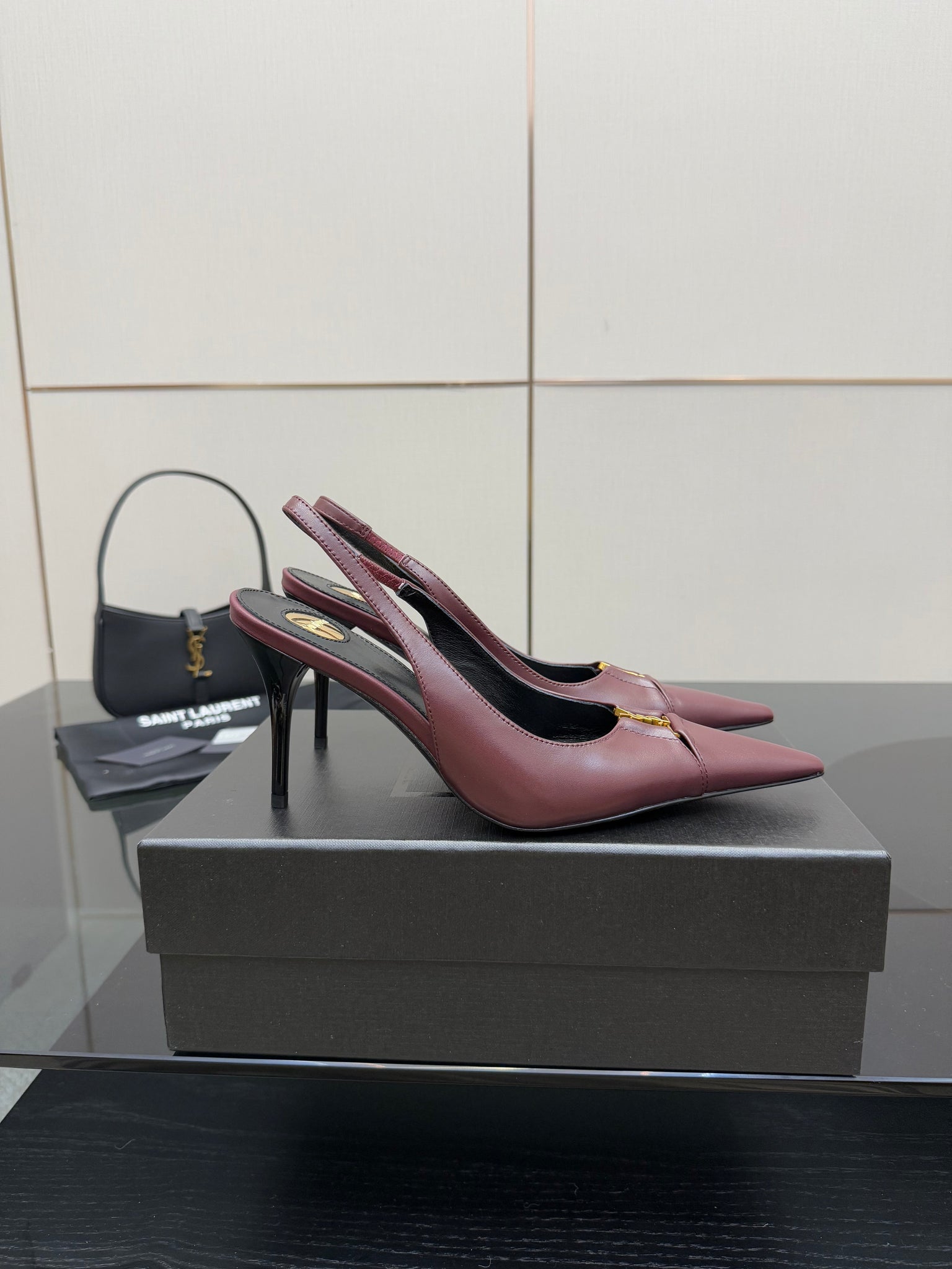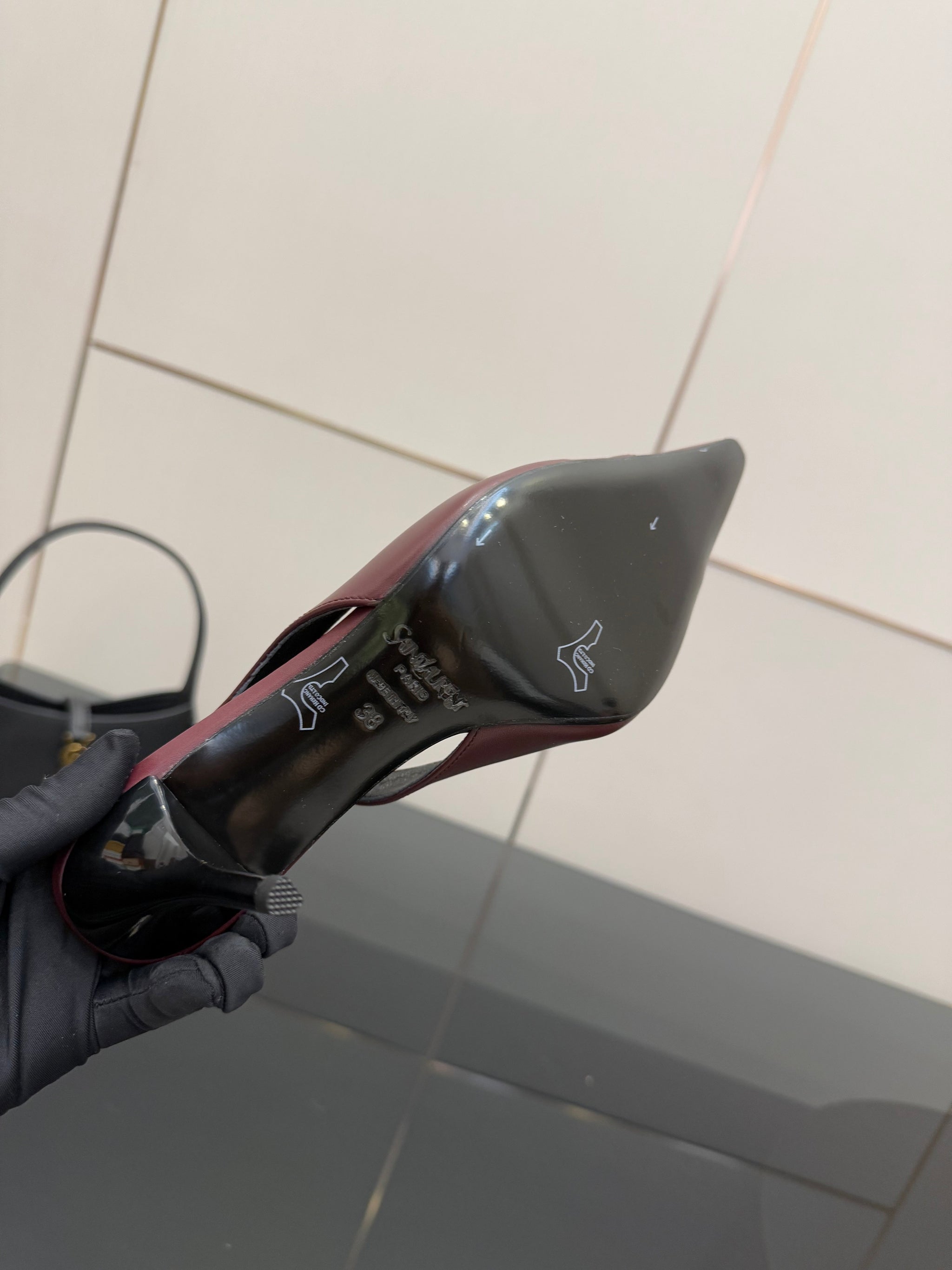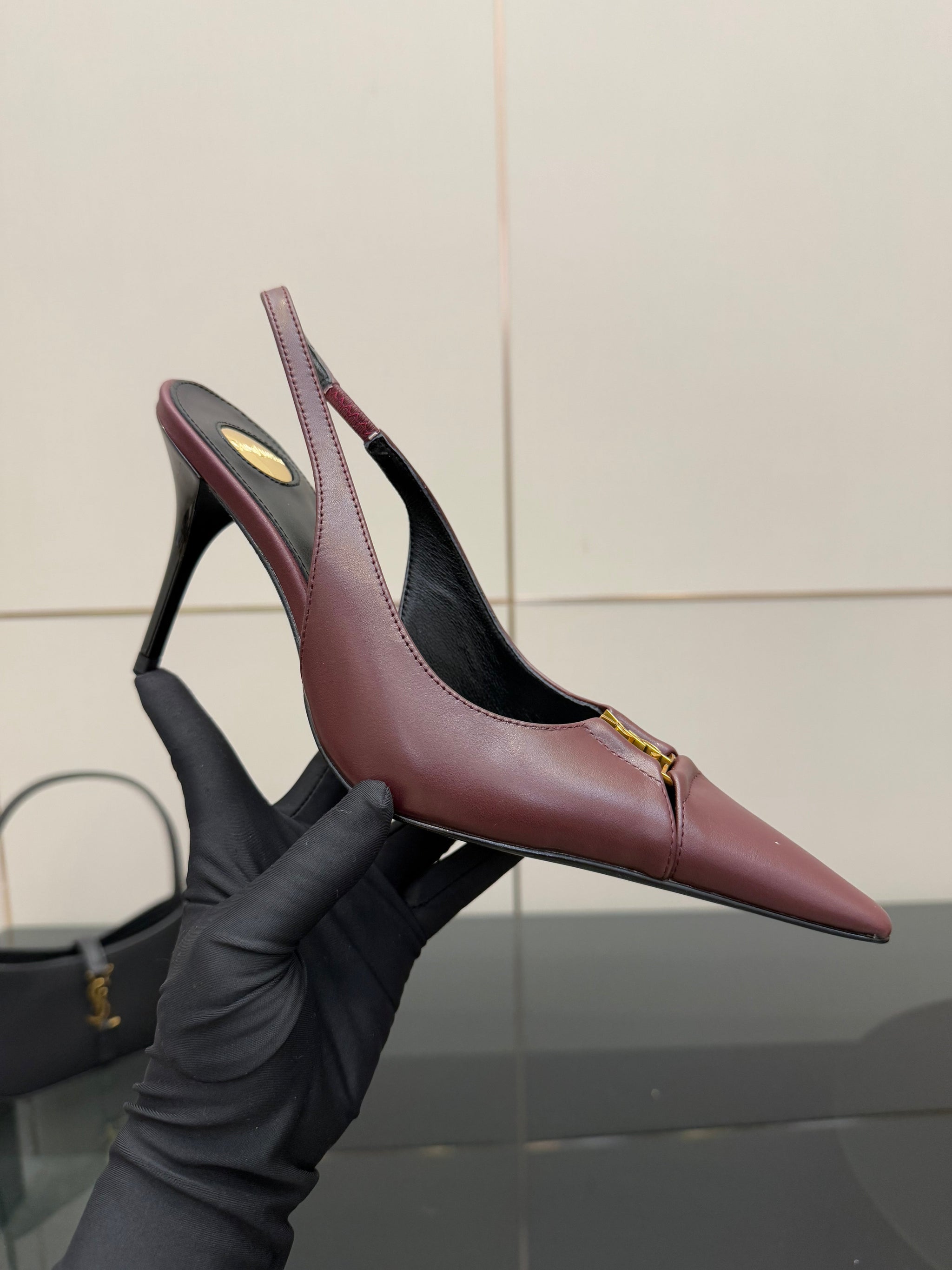 YSL 25S SLINGBACK HIGH HEELS 90 MM IN DARK RED LAMBSKIN WITH GOLD HARDWARE STYLE 2