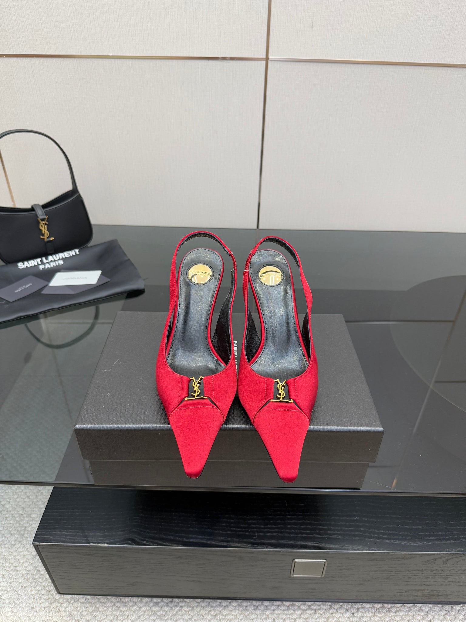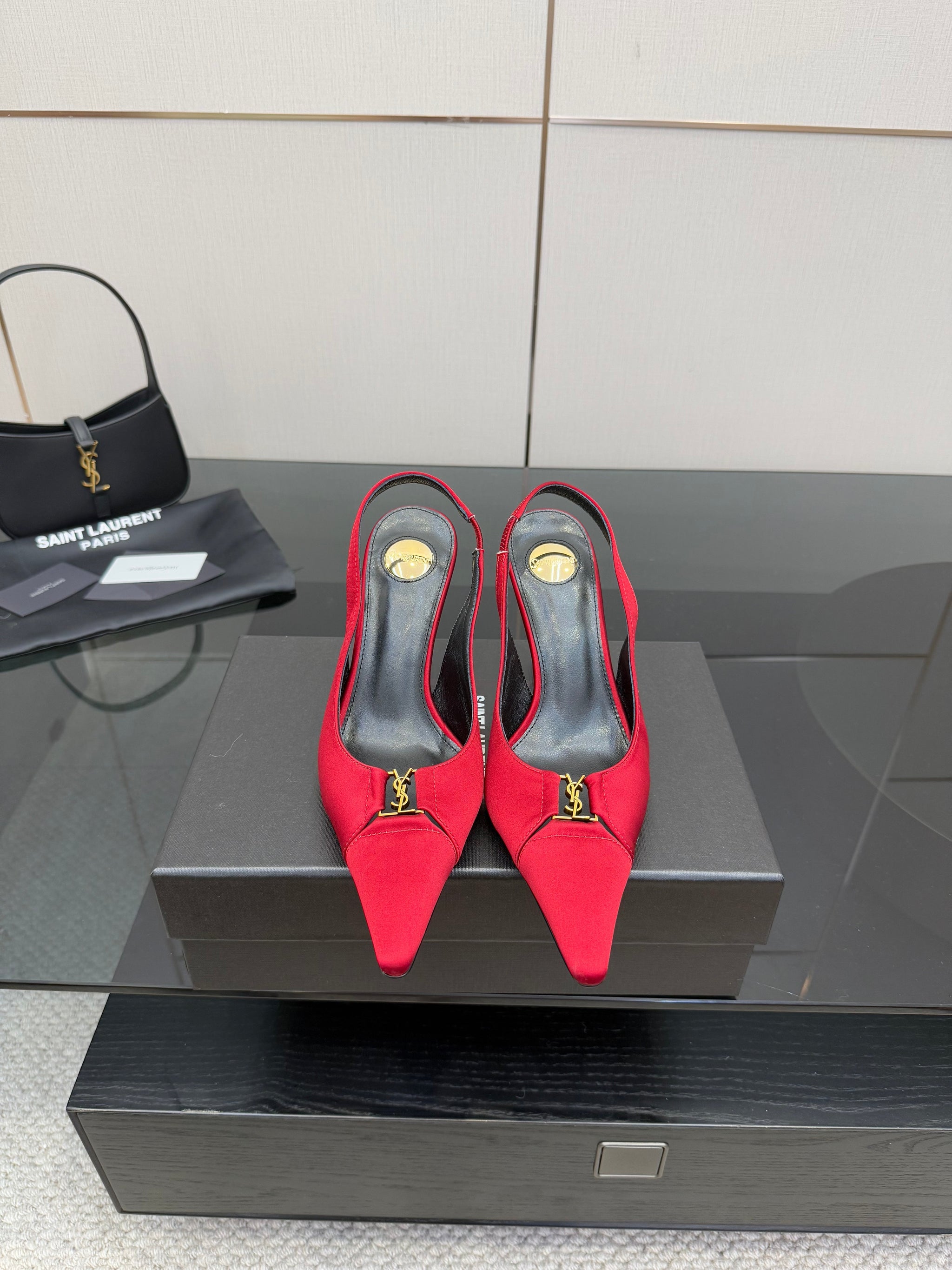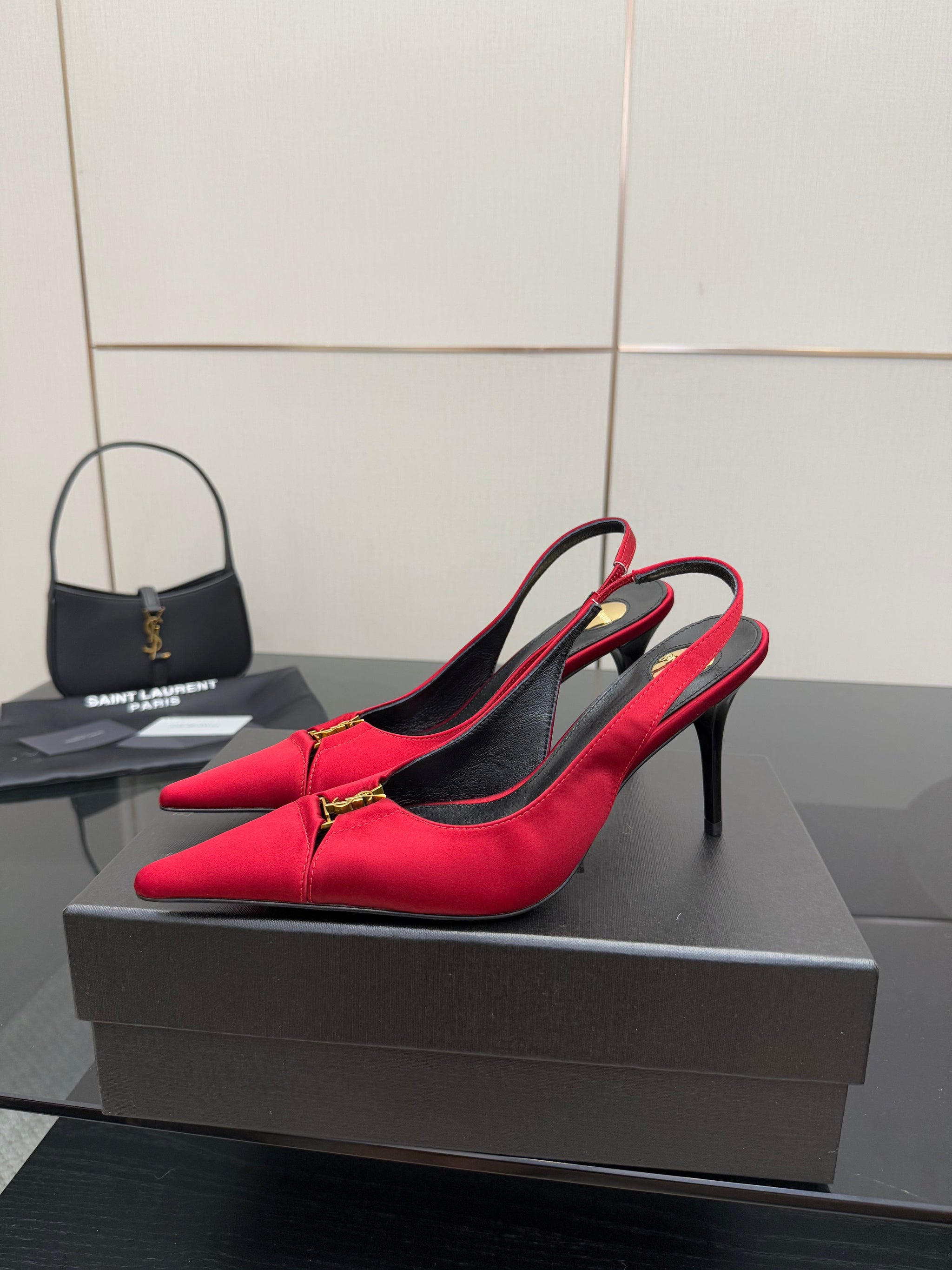 YSL 25S SLINGBACK HIGH HEELS 90 MM IN RED SATIN WITH GOLD HARDWARE STYLE 14