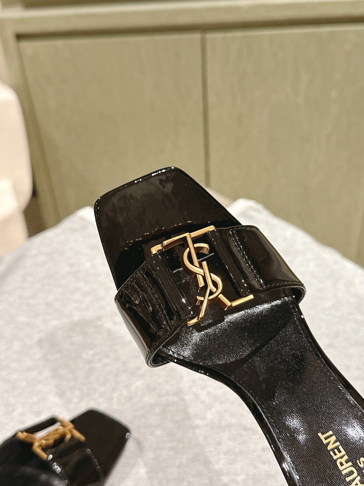 YSL 25S SQUARE-TOE HIGH-HEEL SANDALS 100 MM IN BLACK GLOSSY LAMBSKIN WITH GOLD HARDWARE