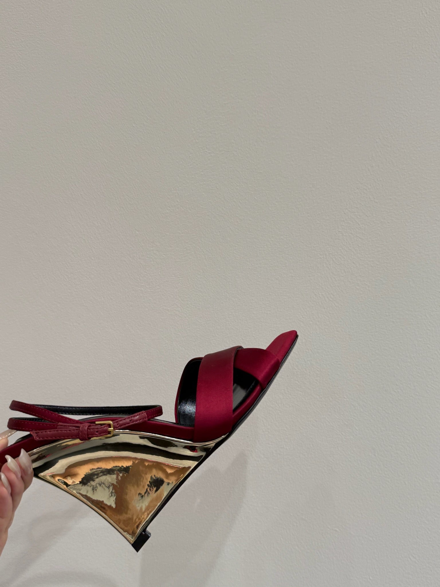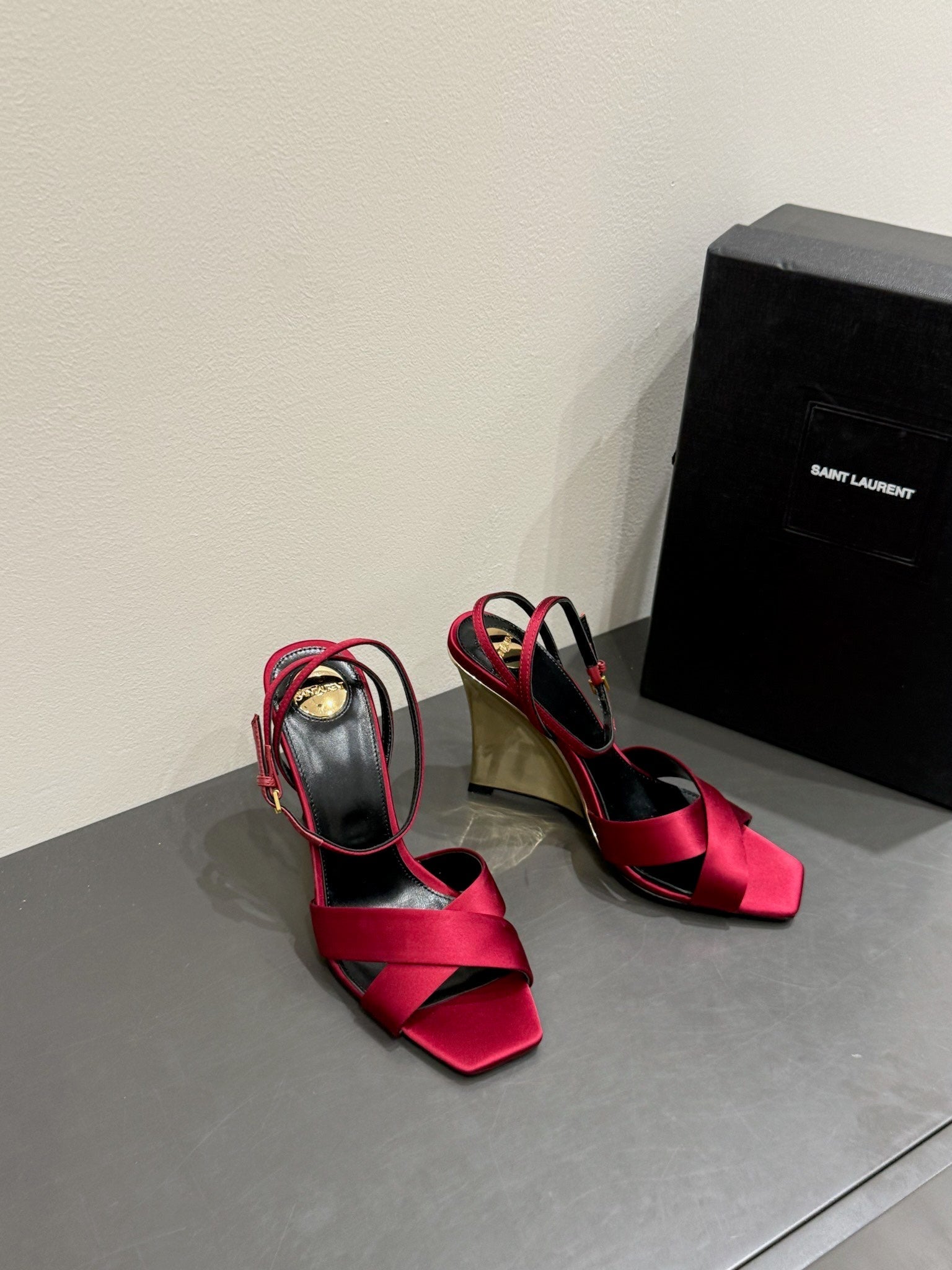 YSL STRAPPY WEDGE SANDALS 25S IN DARK RED SATIN
