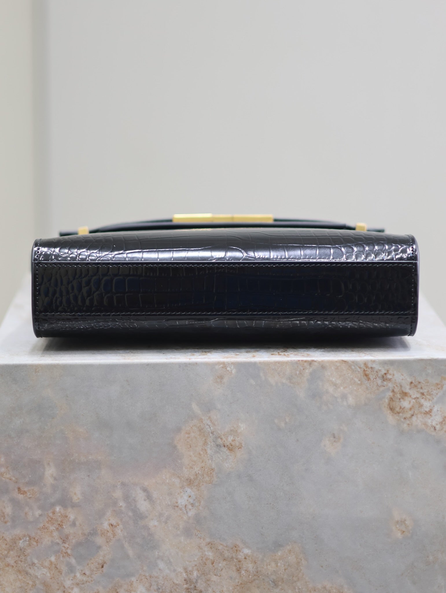 MANHATTAN SMALL 24 IN BLACK CROCODILE PATTERN GLOSSY CALFSKIN GOLD BUCKLE