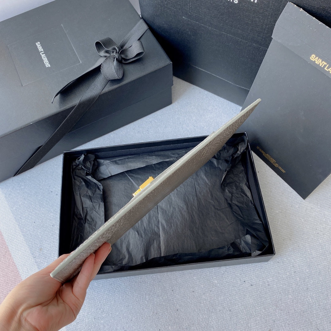 UPTOWN POUCH 27 IN PASTEL GRAY CROCODILE-EMBOSSED SHINY CALFSKIN GOLD LOGO