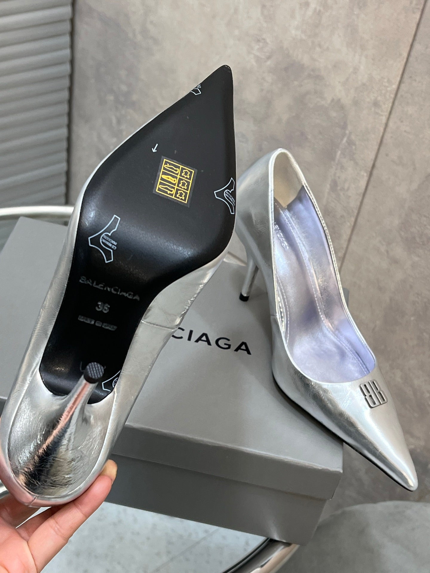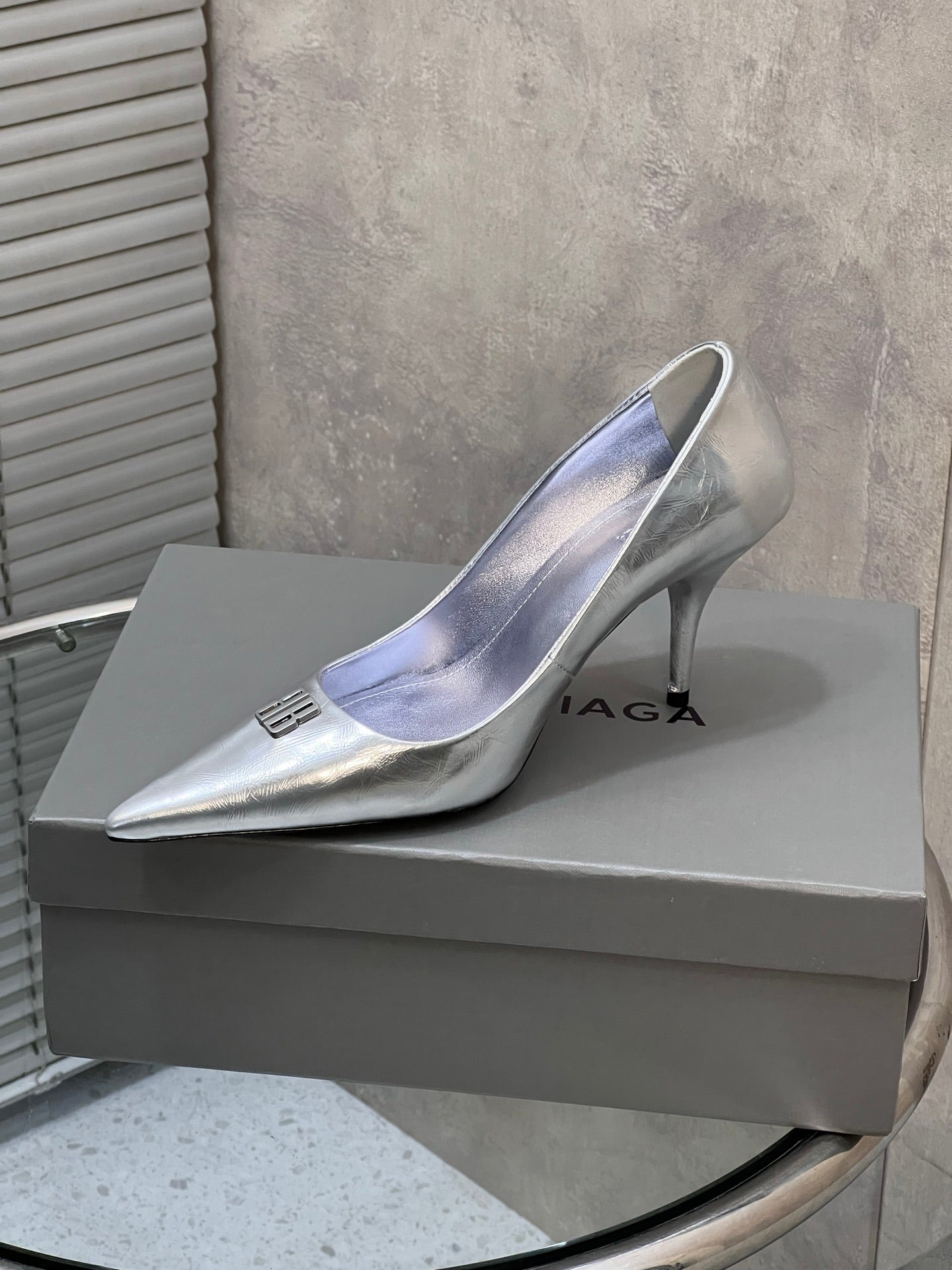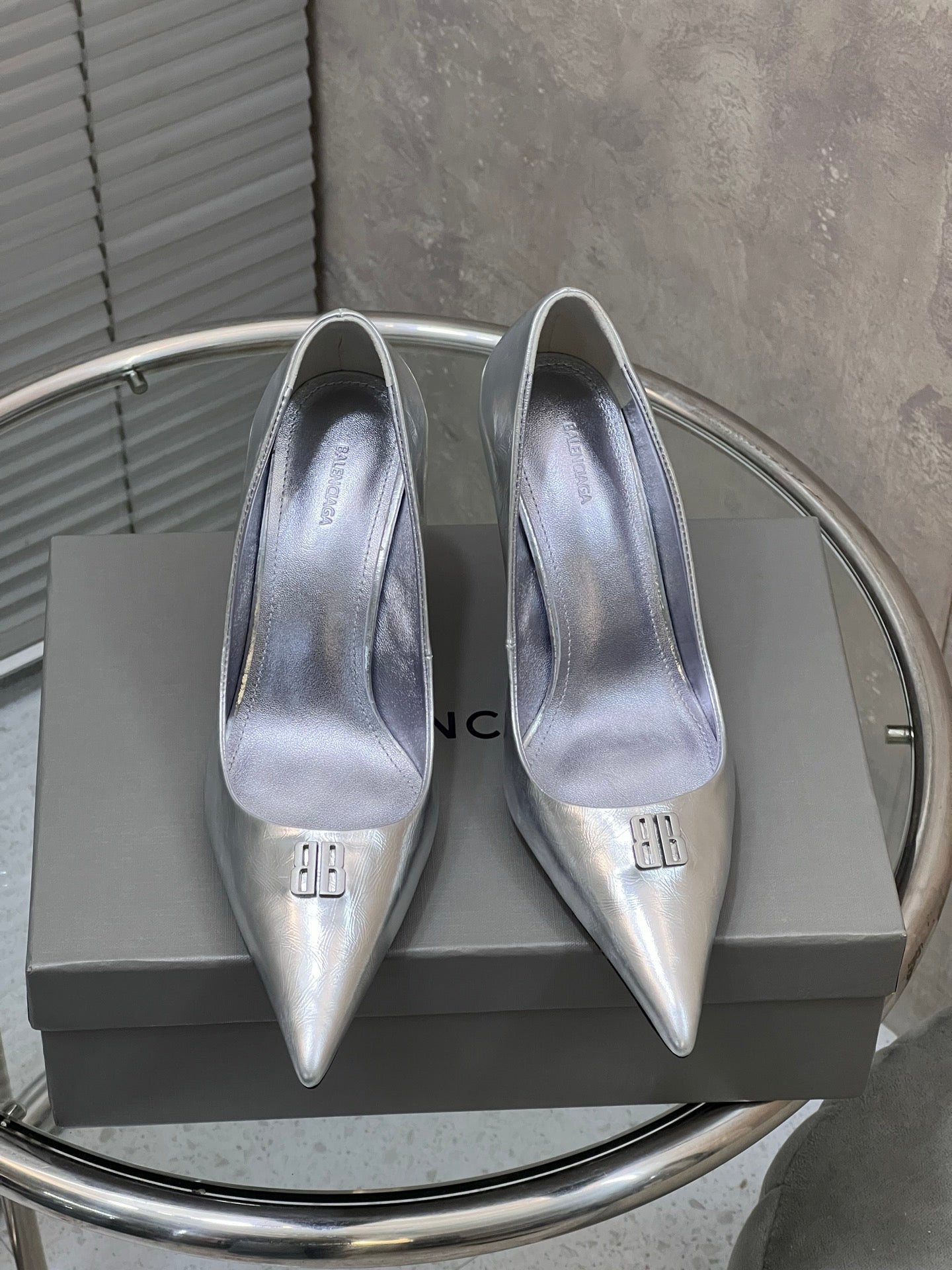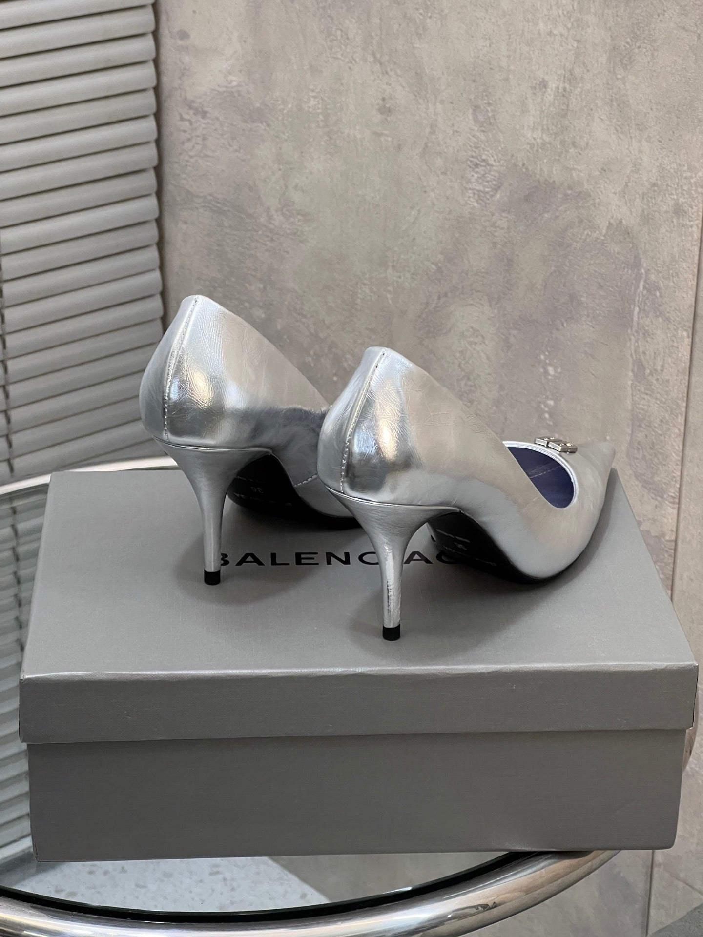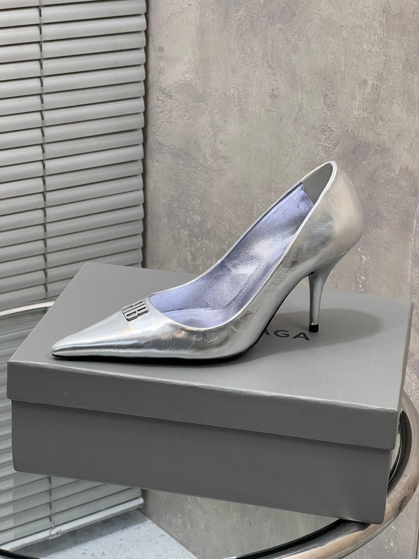 BALENCIAGA 25S HIGH-HEEL SHOES 85 MM IN SILVER COW LEATHER
