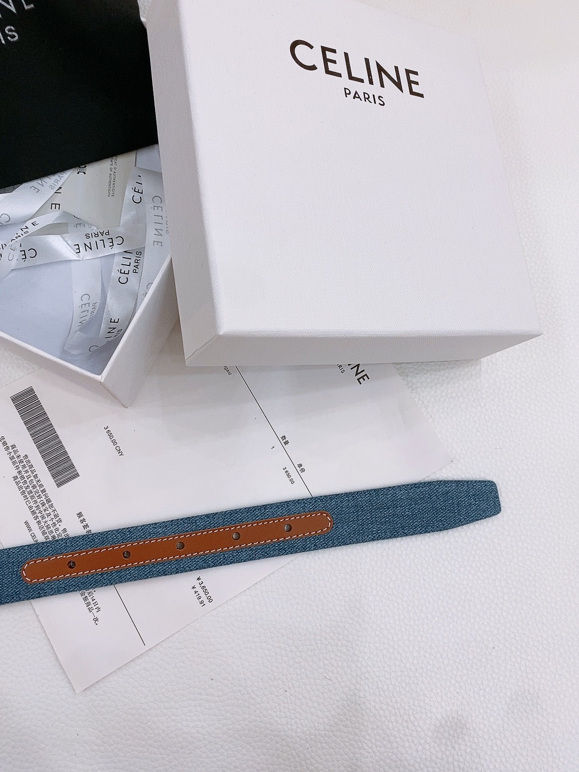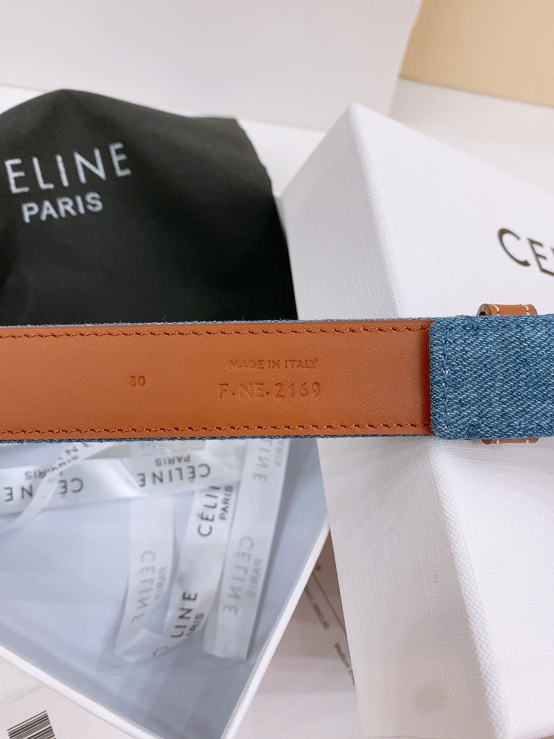CELINE 25S BELT TRIOMPHE TAURILLON 25MM IN BROWN CALFSKIN AND DENIM 558355