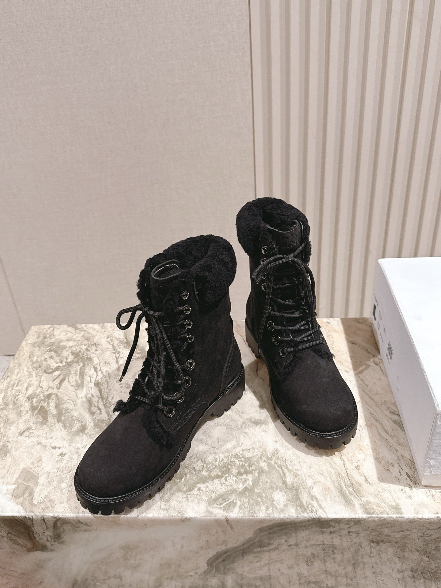 CELINE 25S KURT LACE UP MID BOOT IN BLACK FULL SUEDE AND SHEARLING