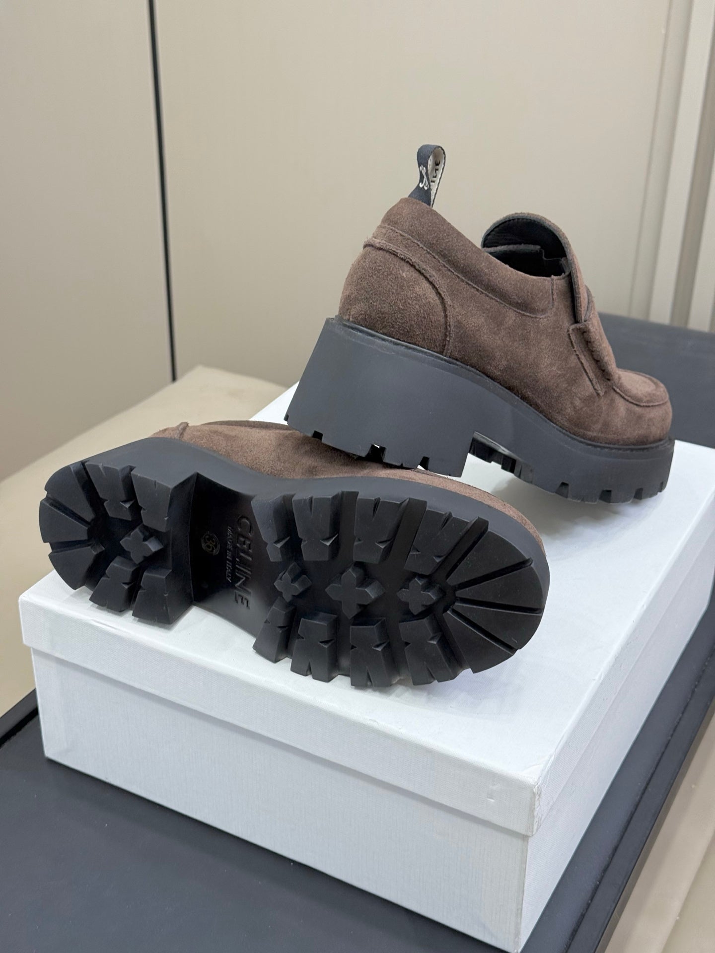 CELINE 25S SERIN CHUNKY LOAFERS 50MM IN BROWN SUEDE