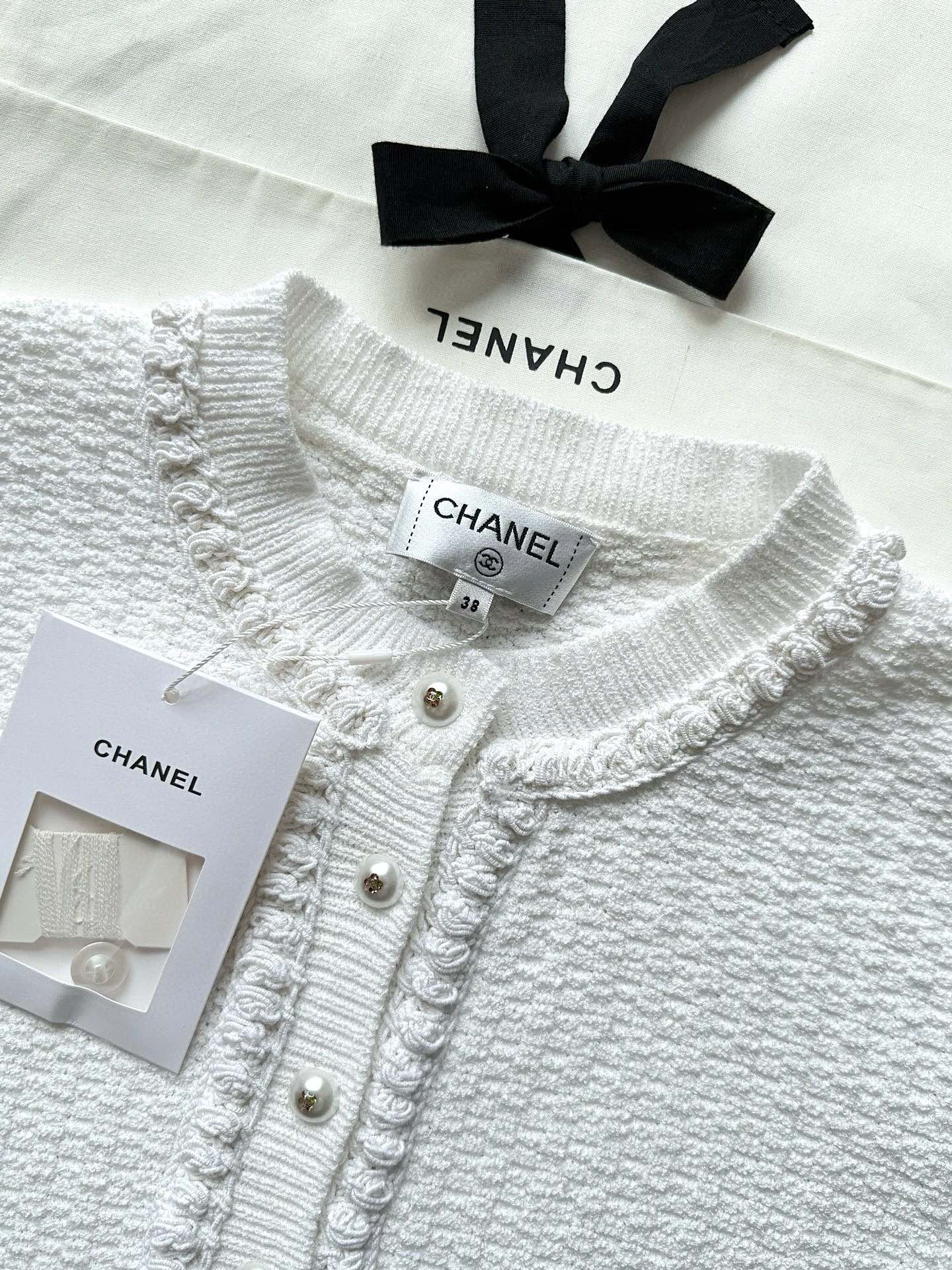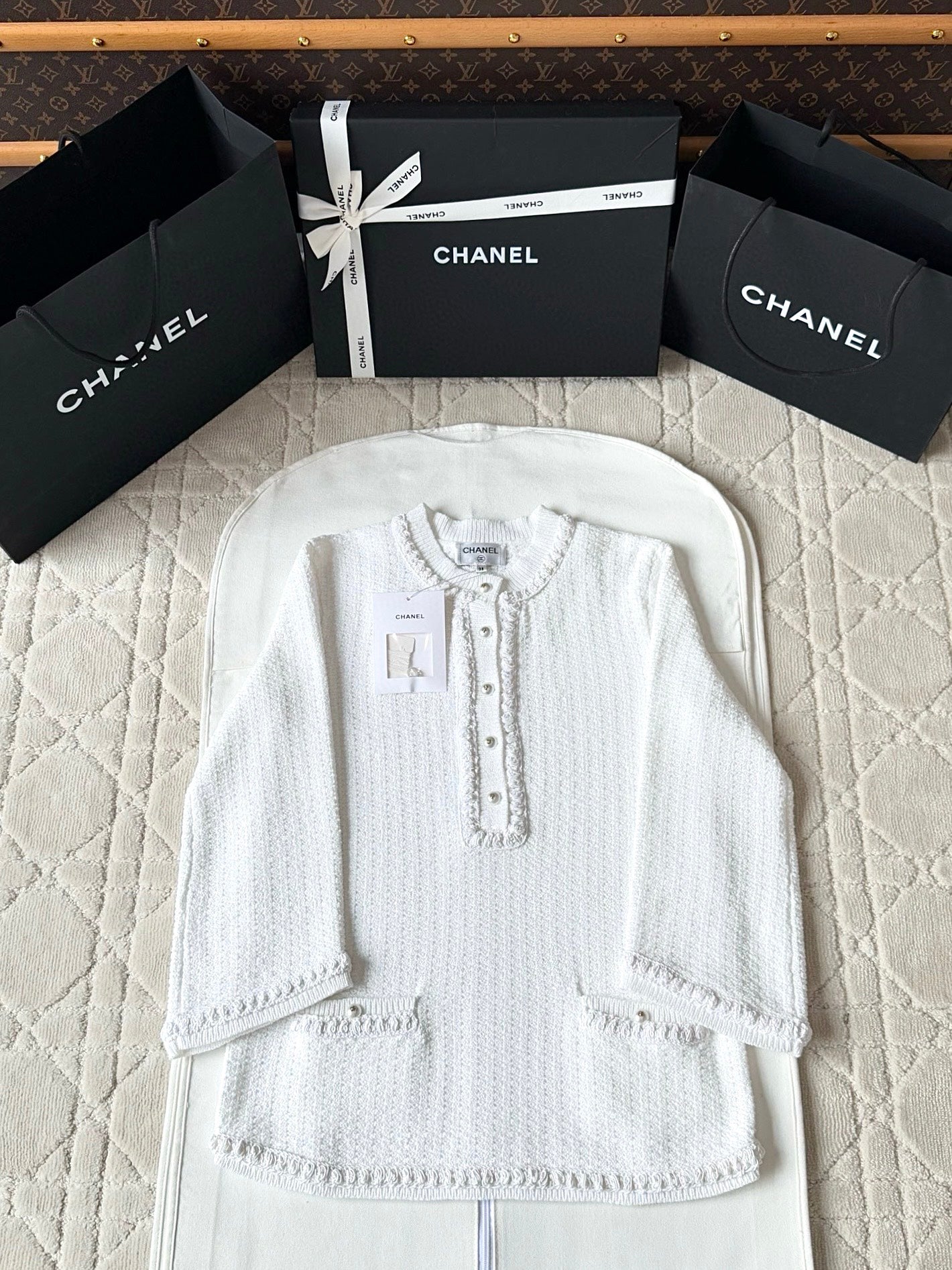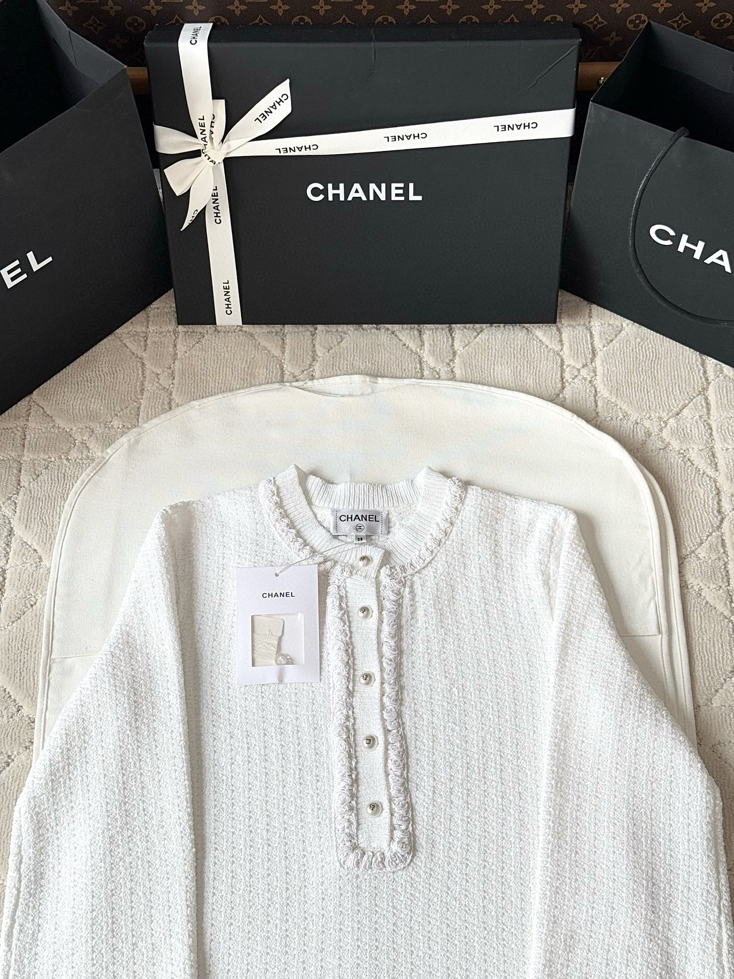 Chanel 25P Long-Sleeve Top White Tweed Pearl Buttons 237299