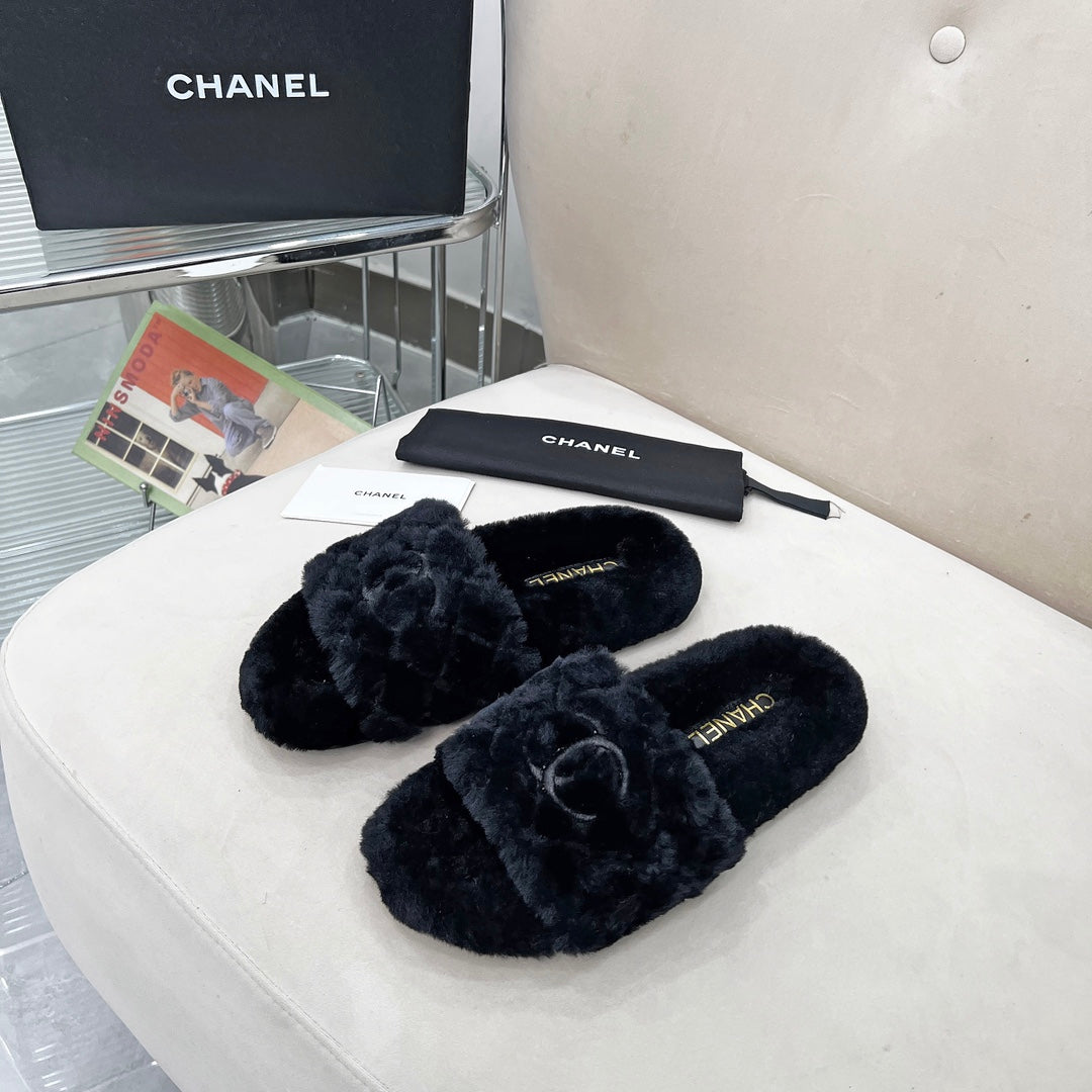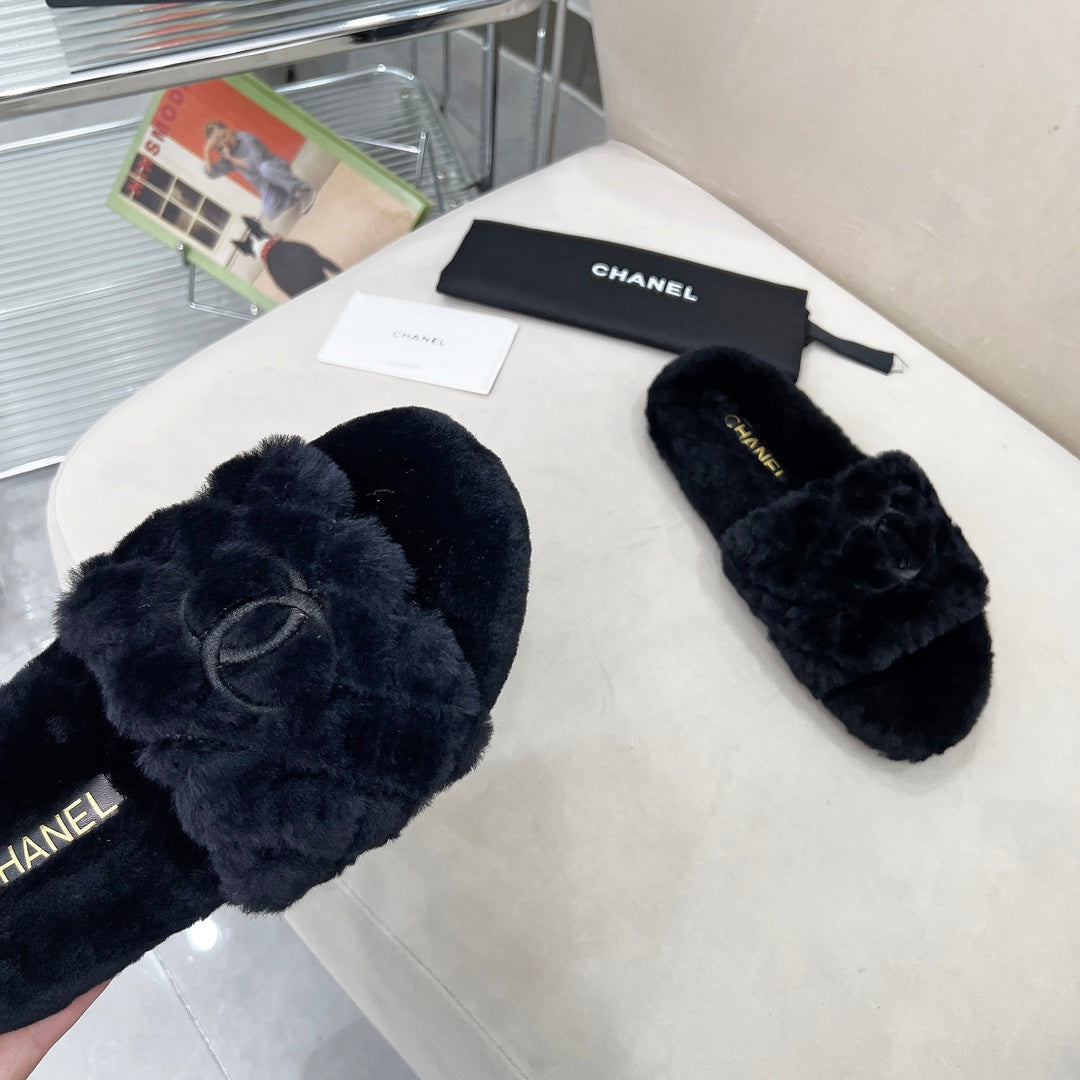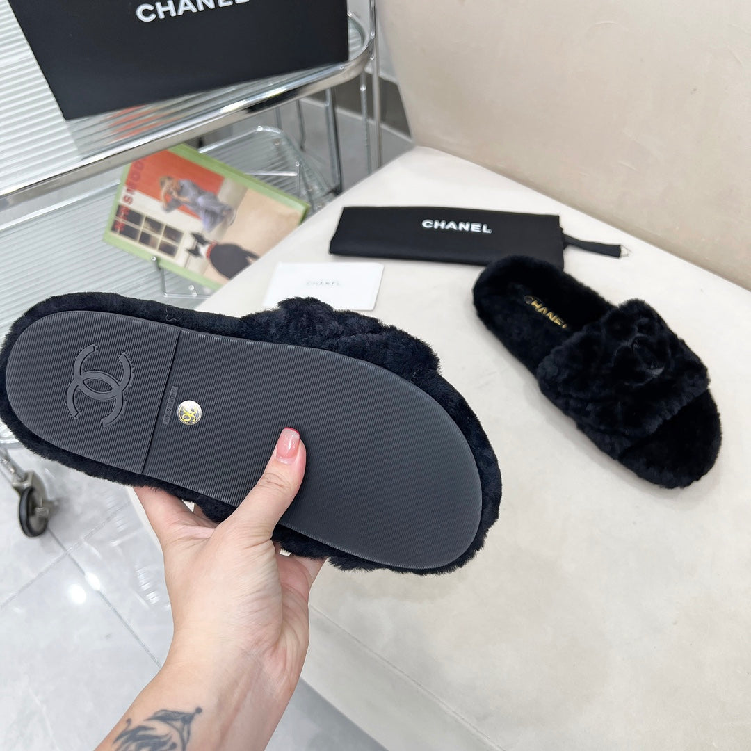 CHANEL 25S FUR SLIPPERS WITH EXPOSED-STITCH STRAPS IN BLACK
