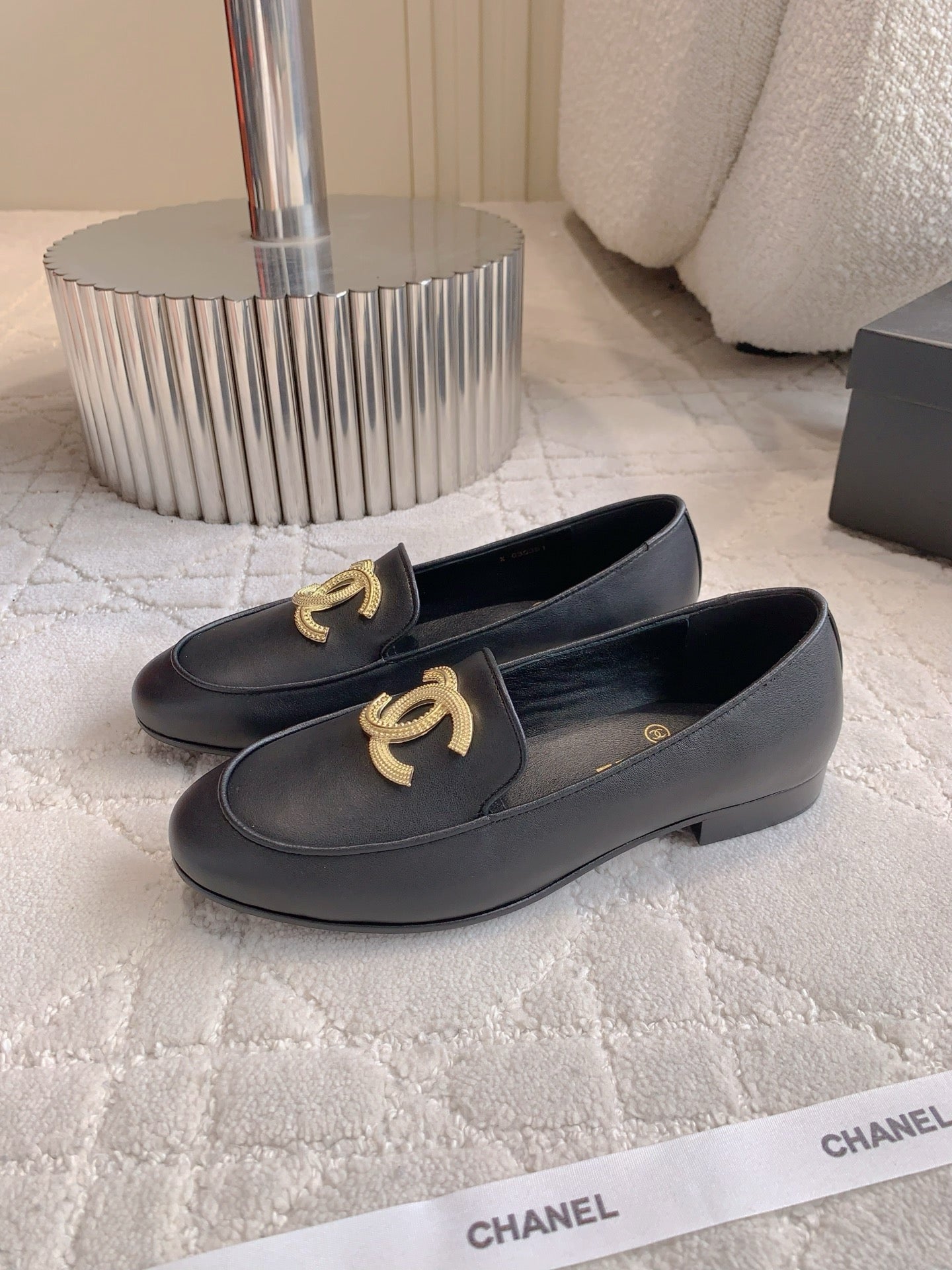 CHANEL 25S LOAFERS WITH LARGE LOGO IN BLACK CALFSKIN GOLD HARDWARE