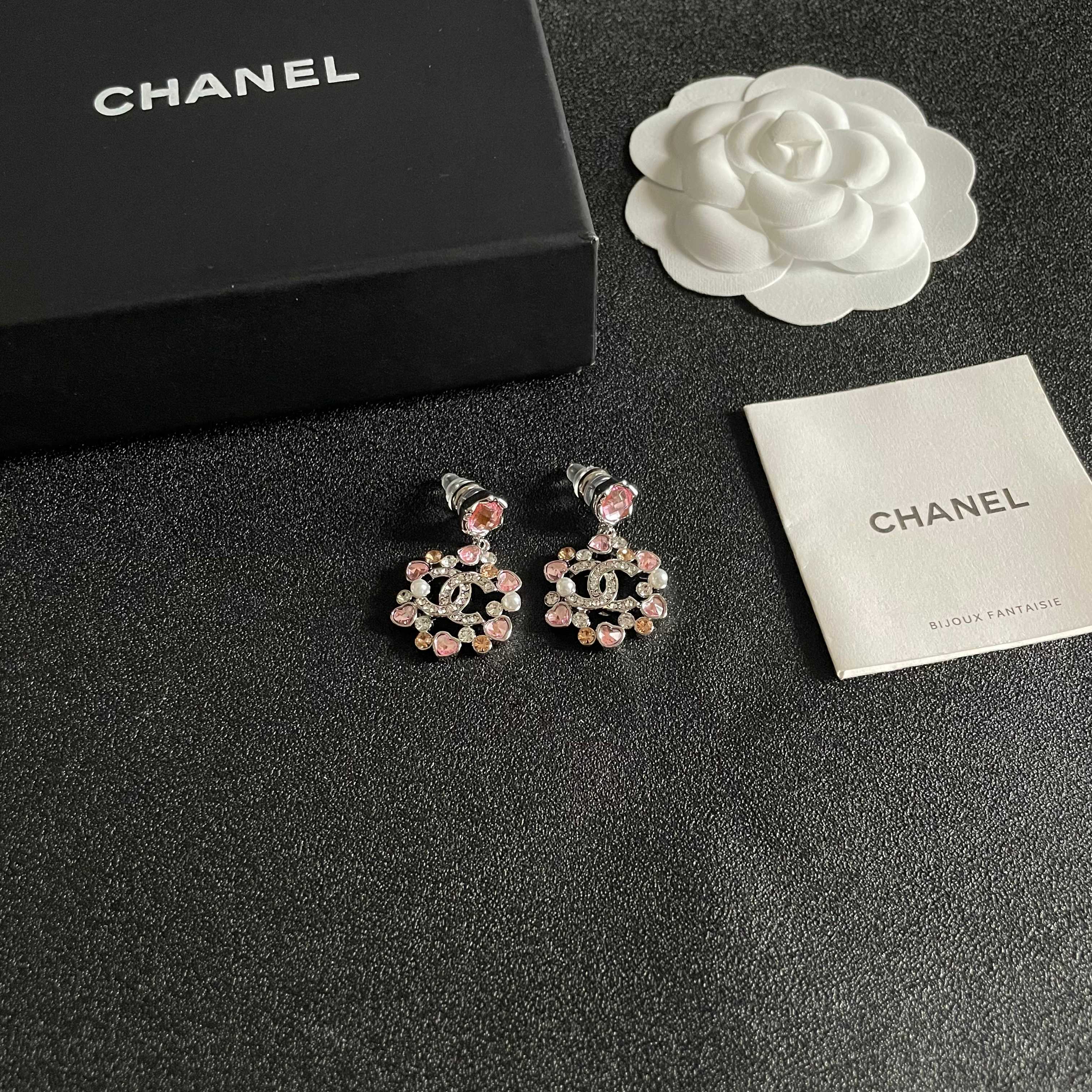 DOUBLE C STUD EARRINGS IN SILVER METAL WHITE & PINK STONES