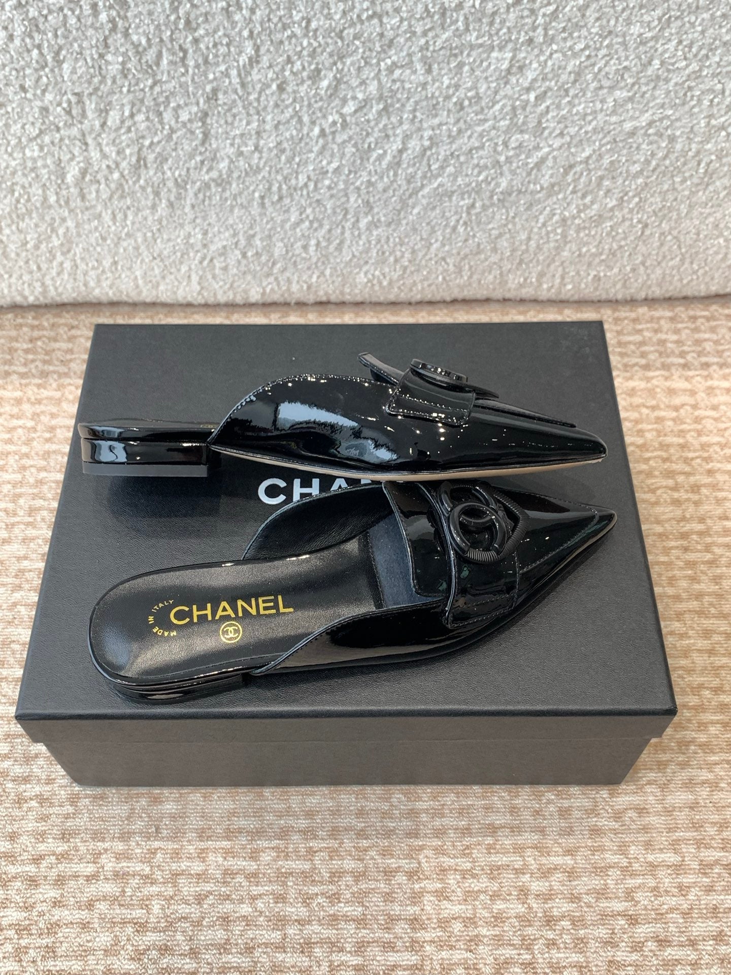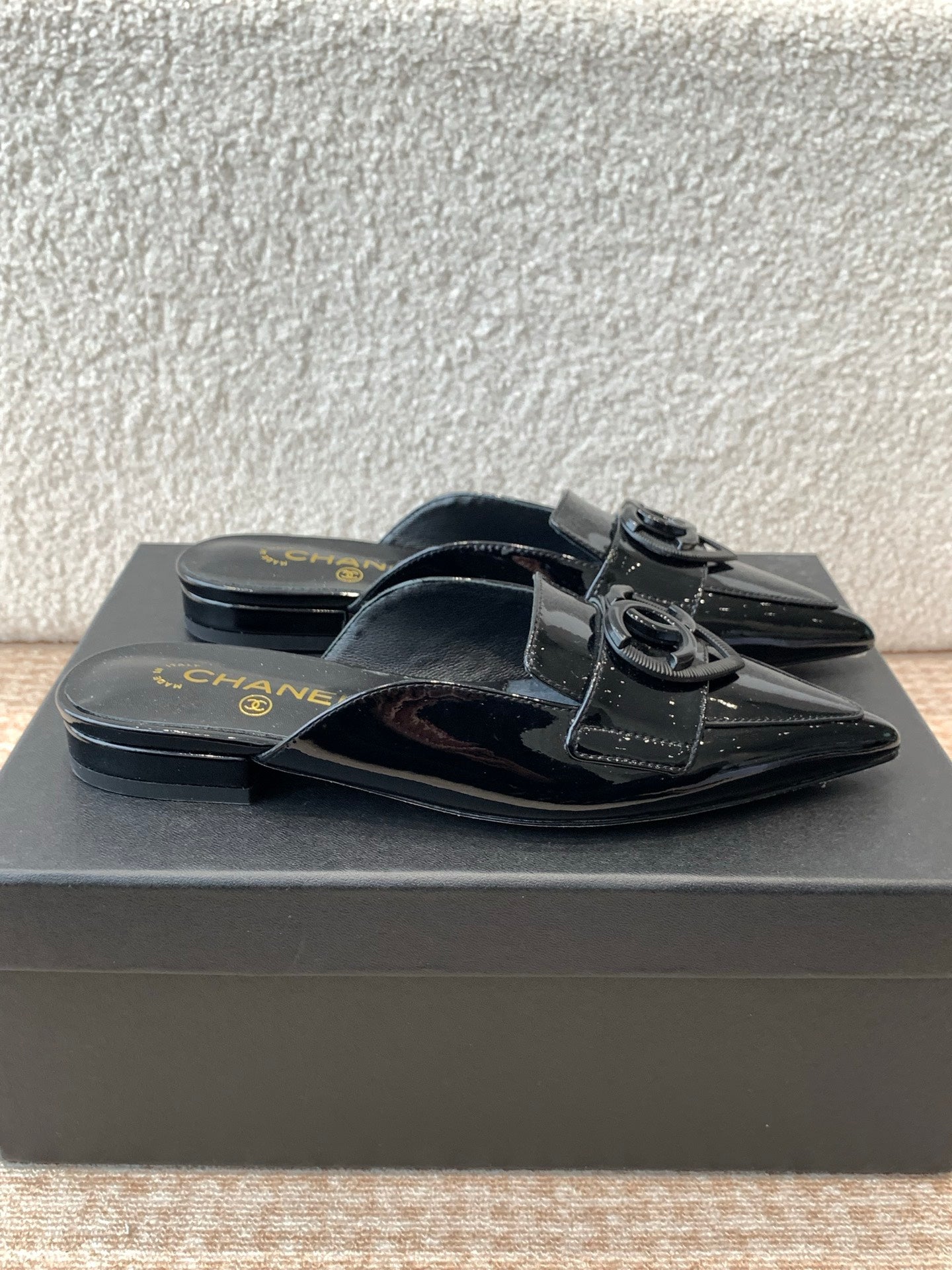 FLAT MULES IN BLACK PATENT CALFSKIN