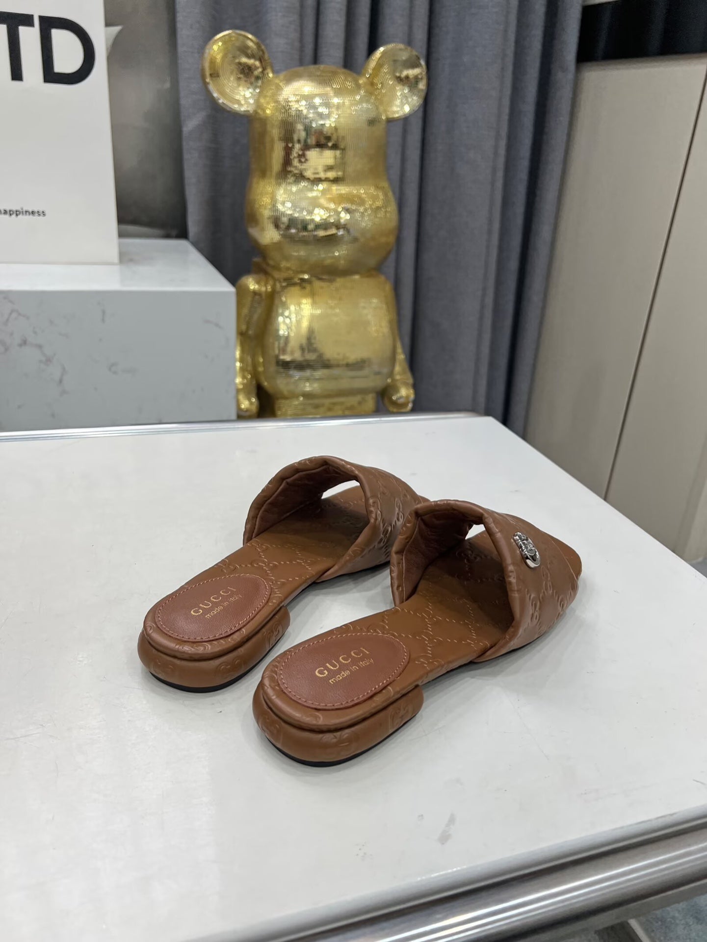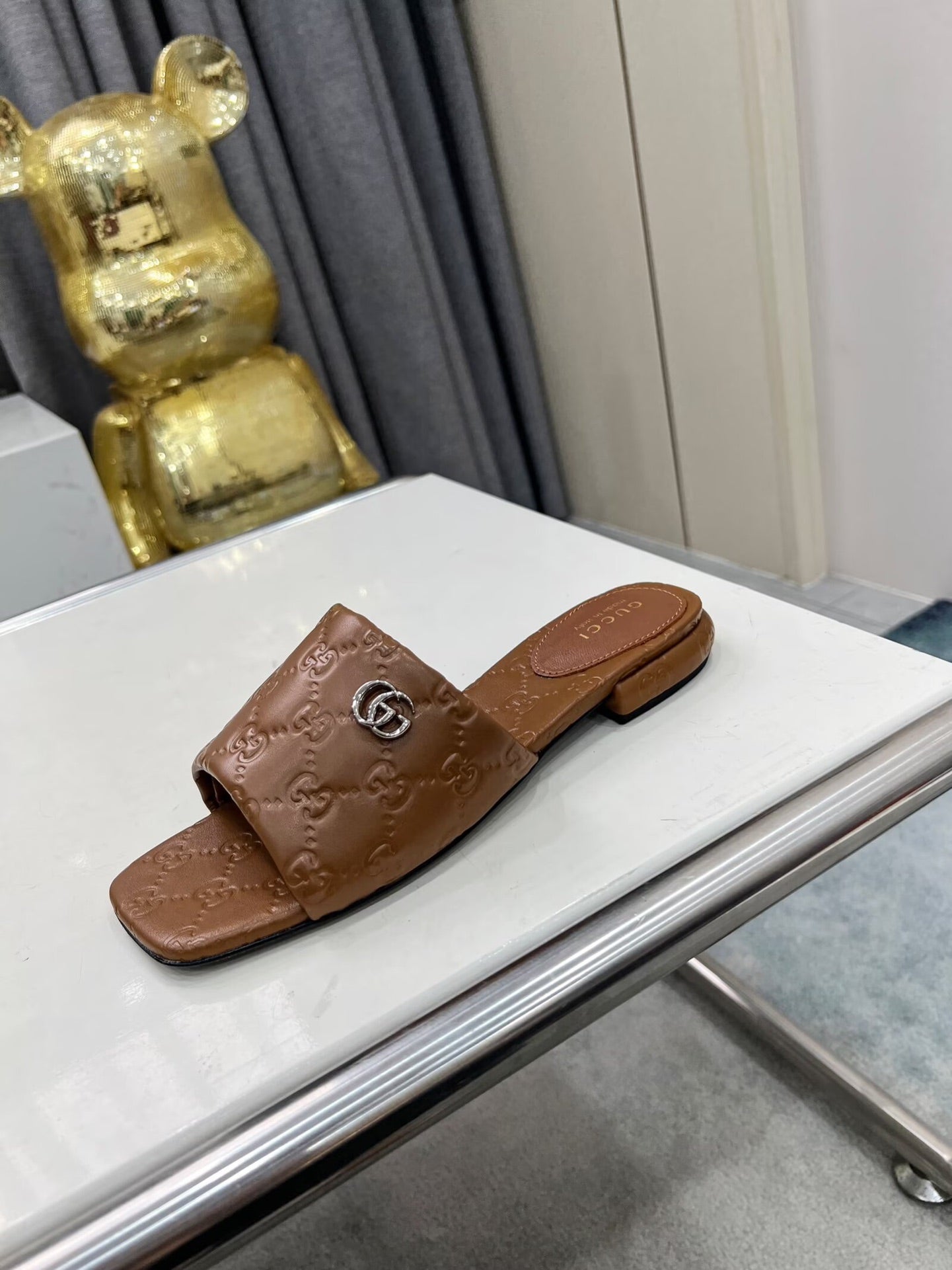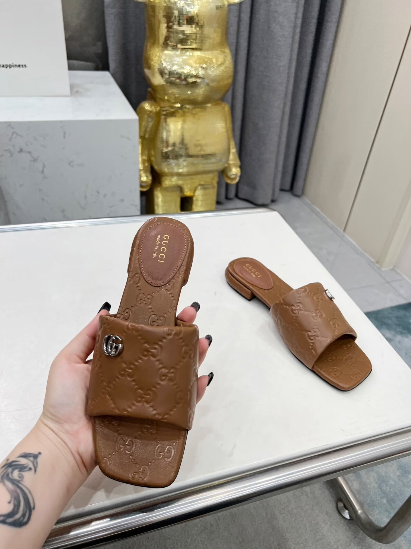 GG CASUAL SLIPPERS IN BROWN CALFSKIN LOGO EMBOSSING