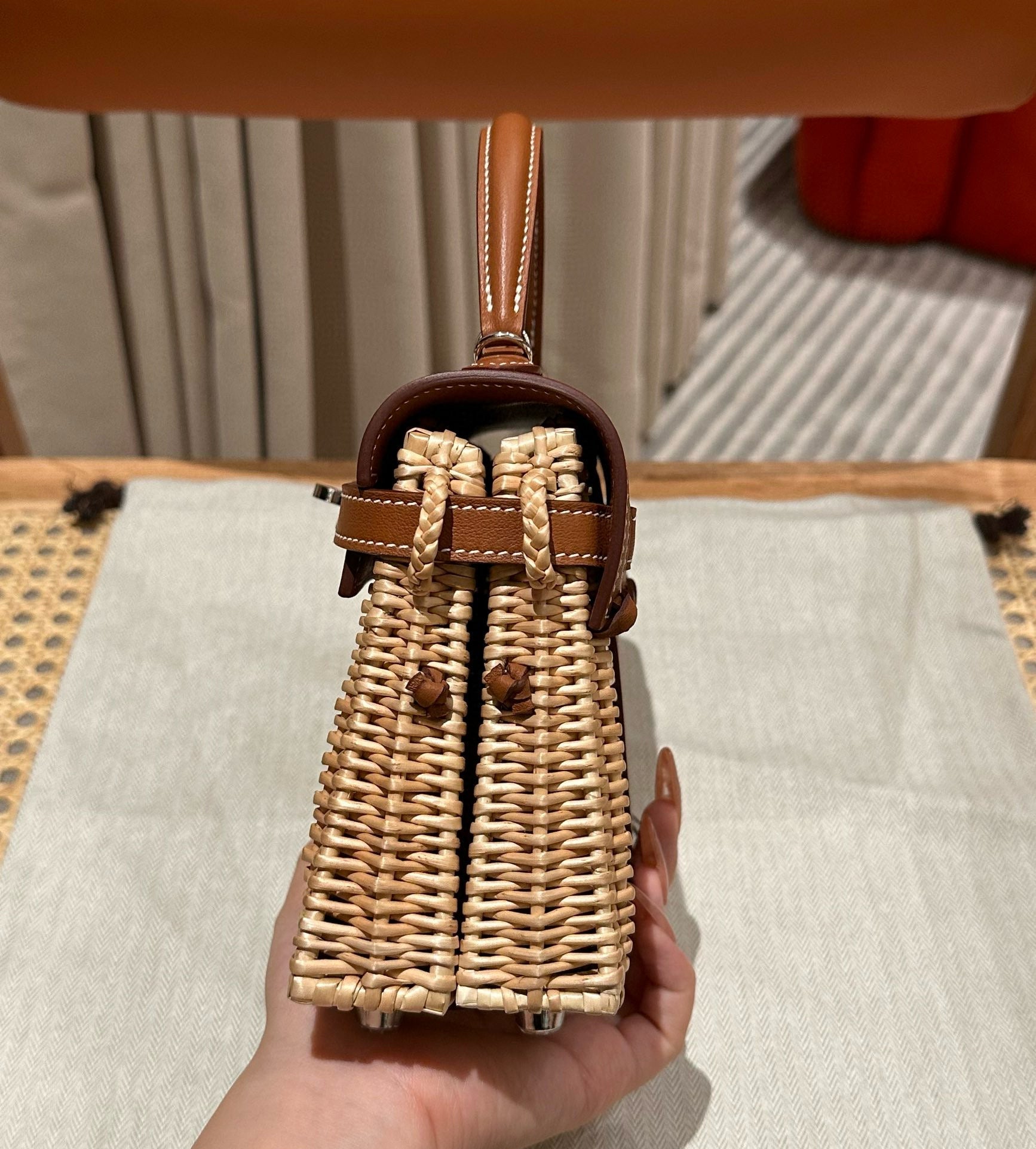 HM KELLY PICNIC HANDBAG IN BROWN & NATURAL LEATHER AND WICKER SILVER HARDWARE