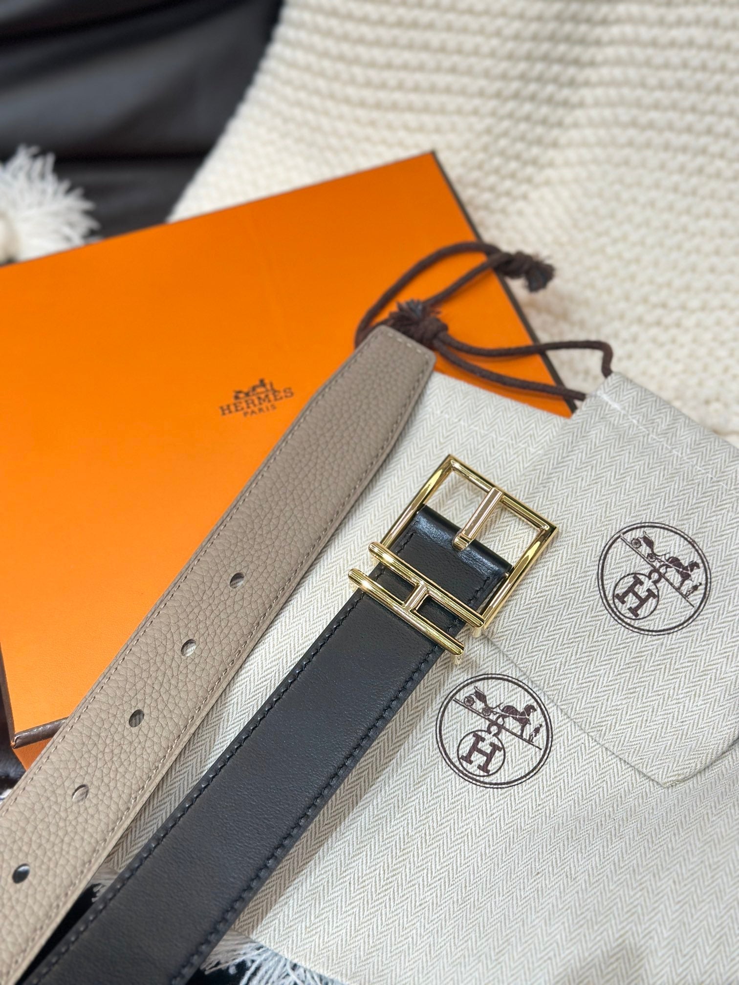 HM NATHAN 32MM REVERSIBLE BELT IN BLACK AND TAN LEATHER GOLD BUCKLE