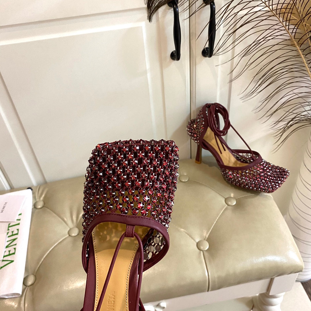LACE-UP SANDAL IN SANGRIA RED METALLIZED MESH AND LEATHER WITH RHINSTONES 9 CM