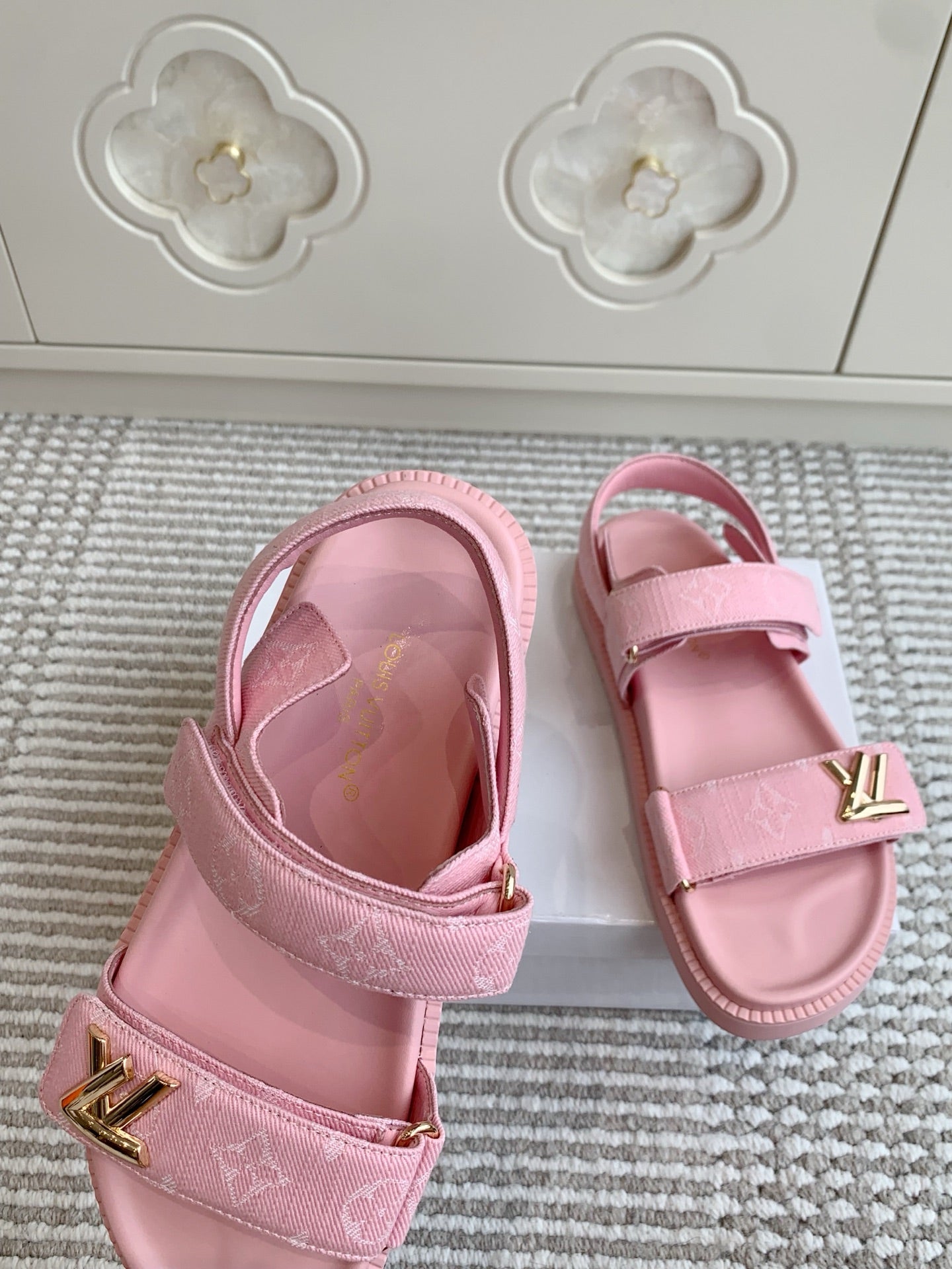 LV SANDALS 25S IN LIGHT PINK DENIM AND CALFSKIN WITH GOLD HARDWARE