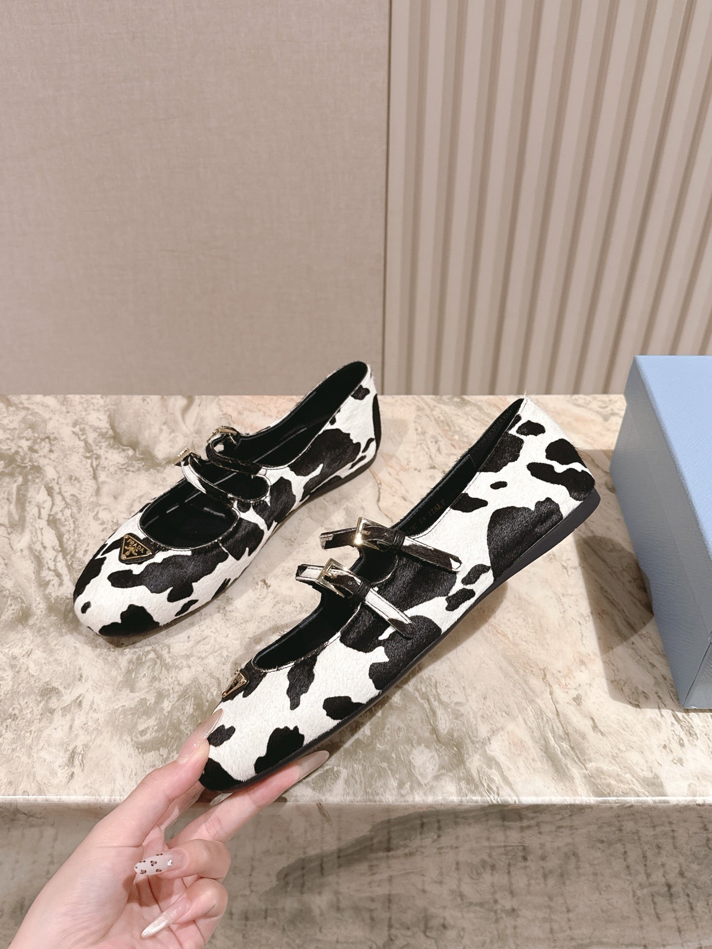 PRADA 25S CRYSTAL EMBELLISHED BALLERINA IN WHITE AND BLACK FUR