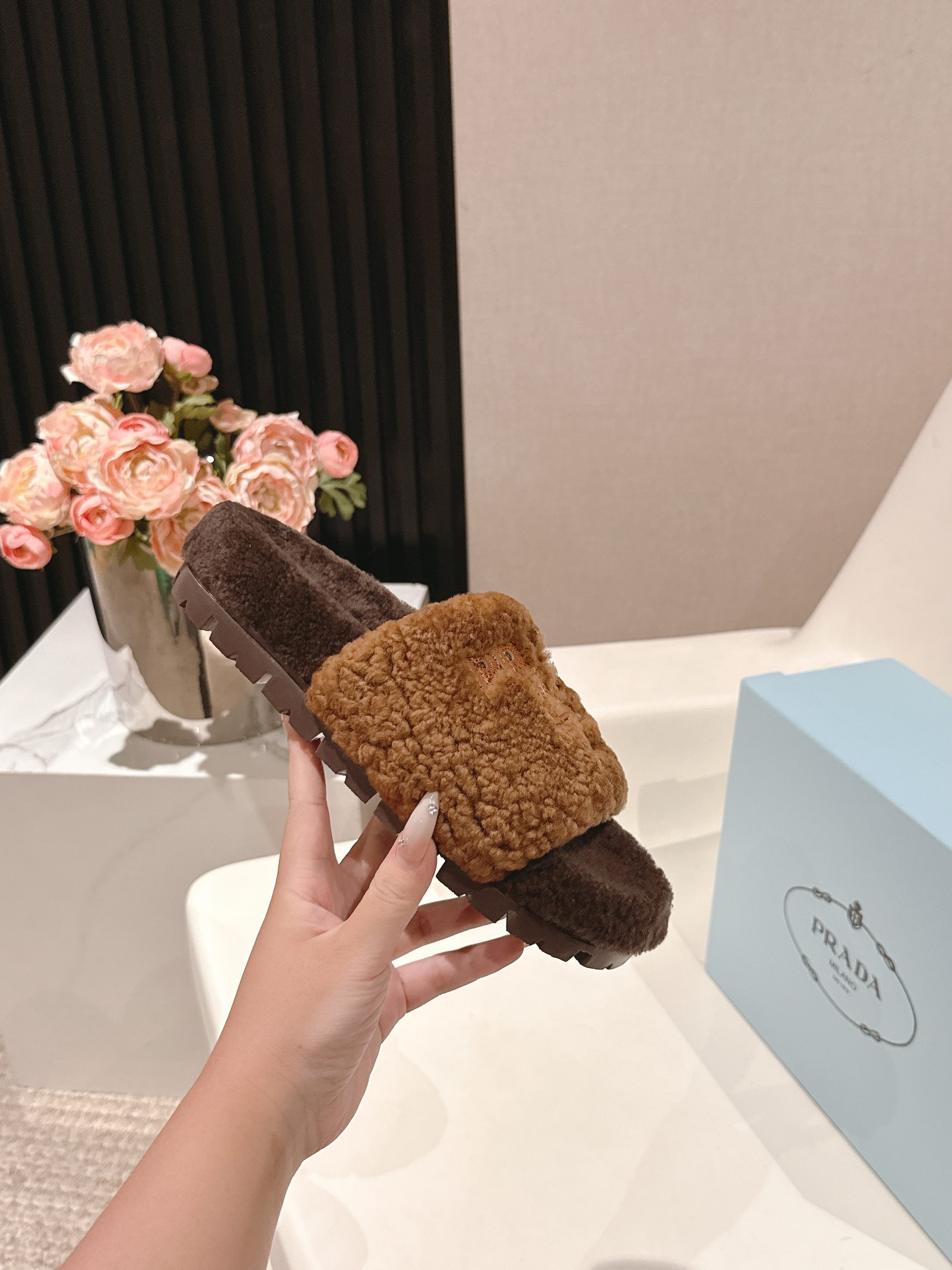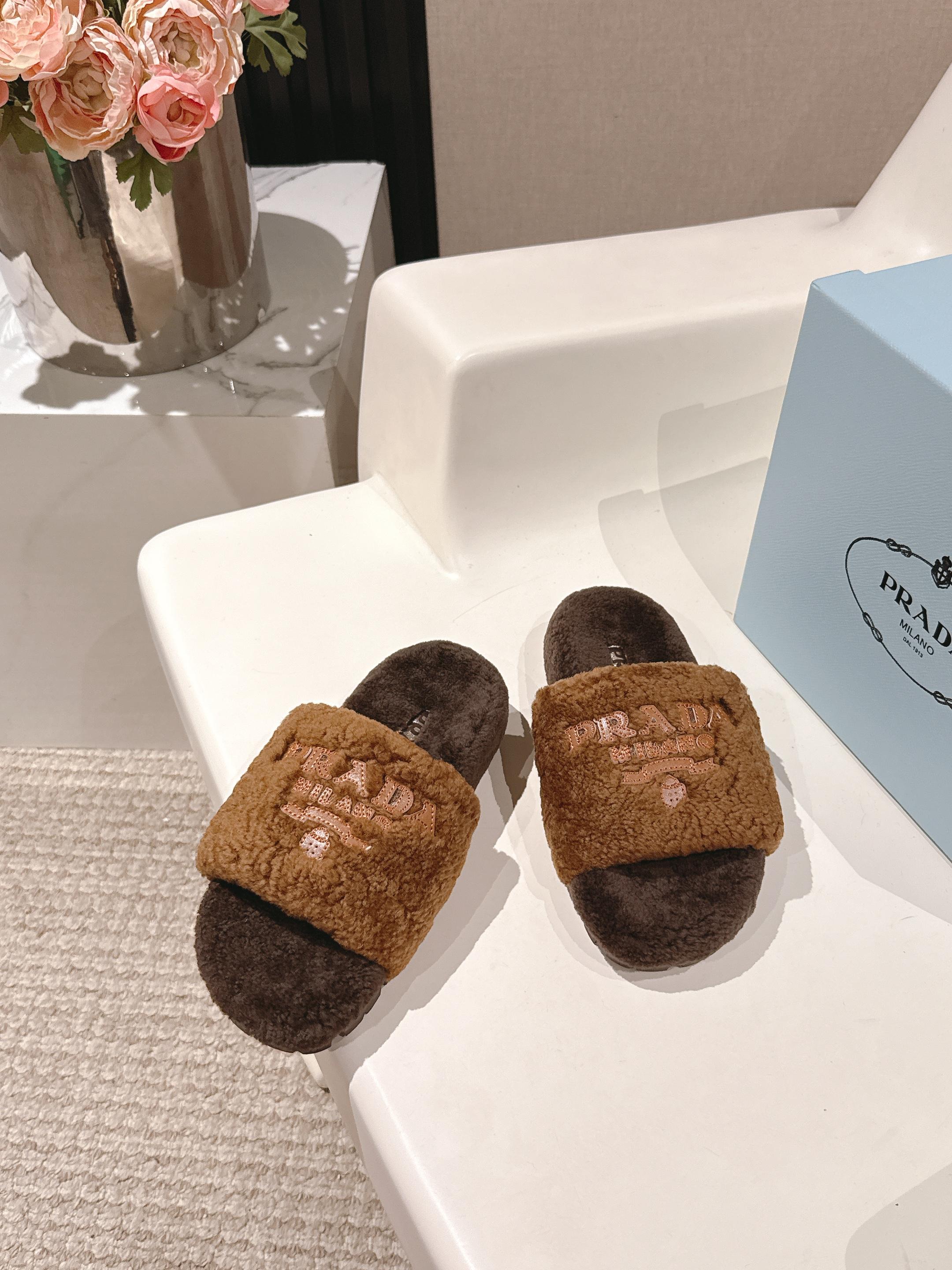 PRADA 25S FLAT MULES IN DARK BROWN RABBIT FUR