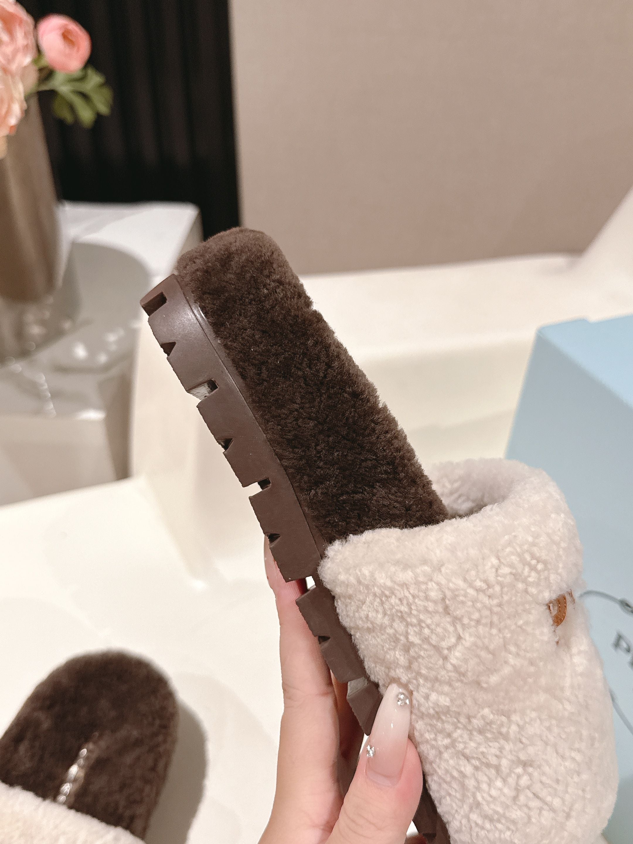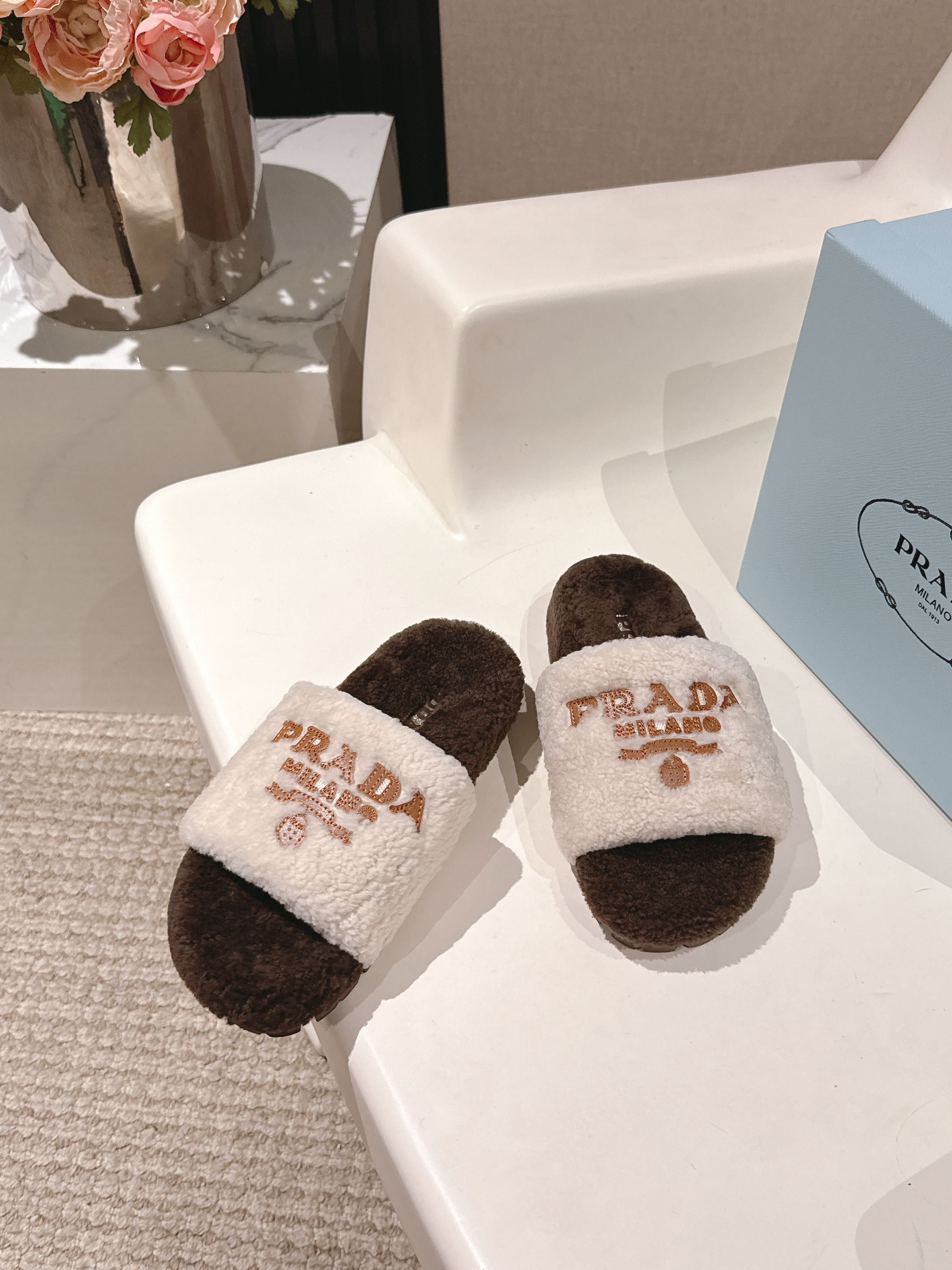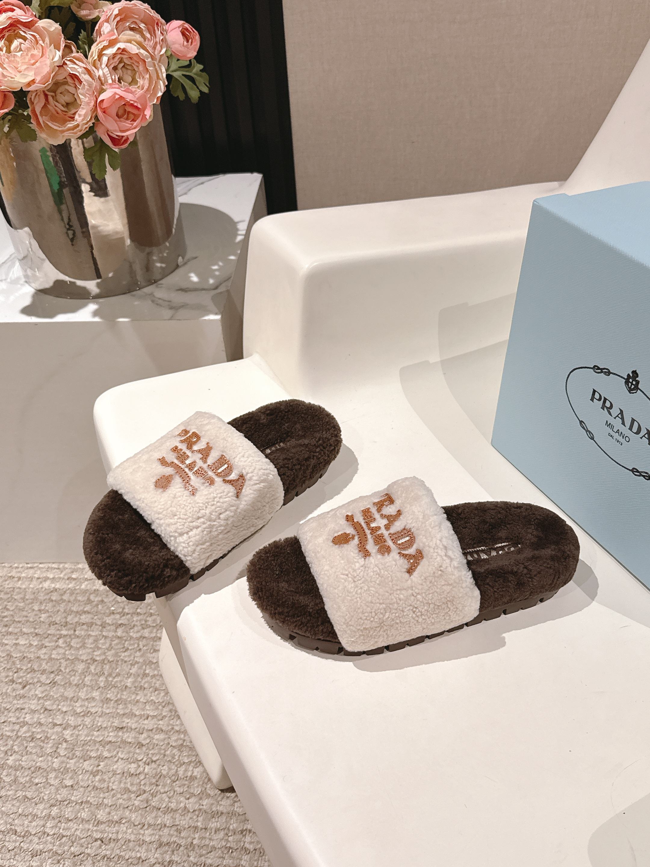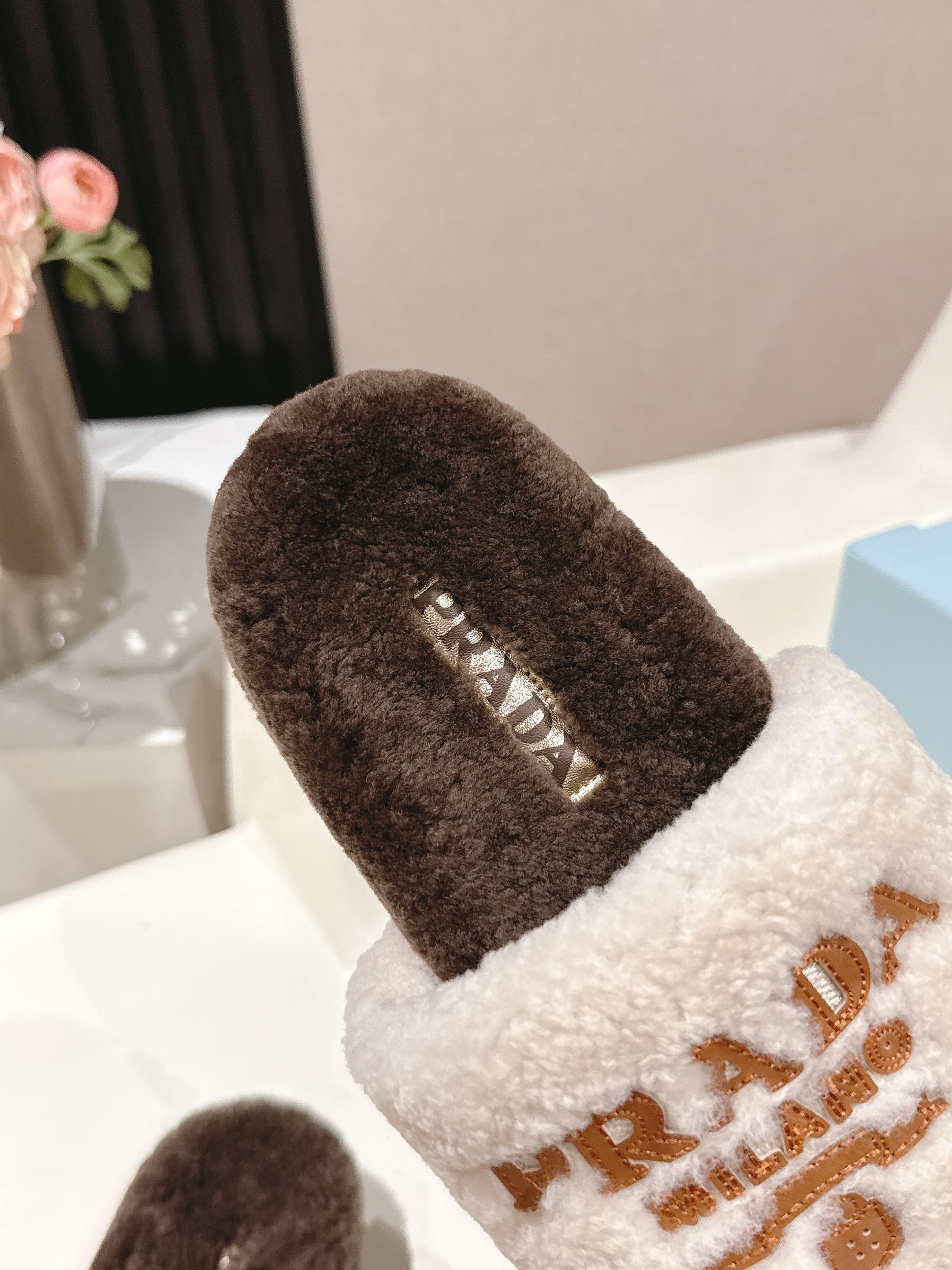 PRADA 25S FLAT MULES IN WHITE AND DARK BROWN RABBIT FUR