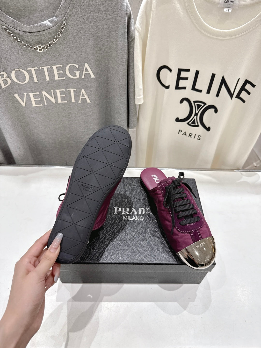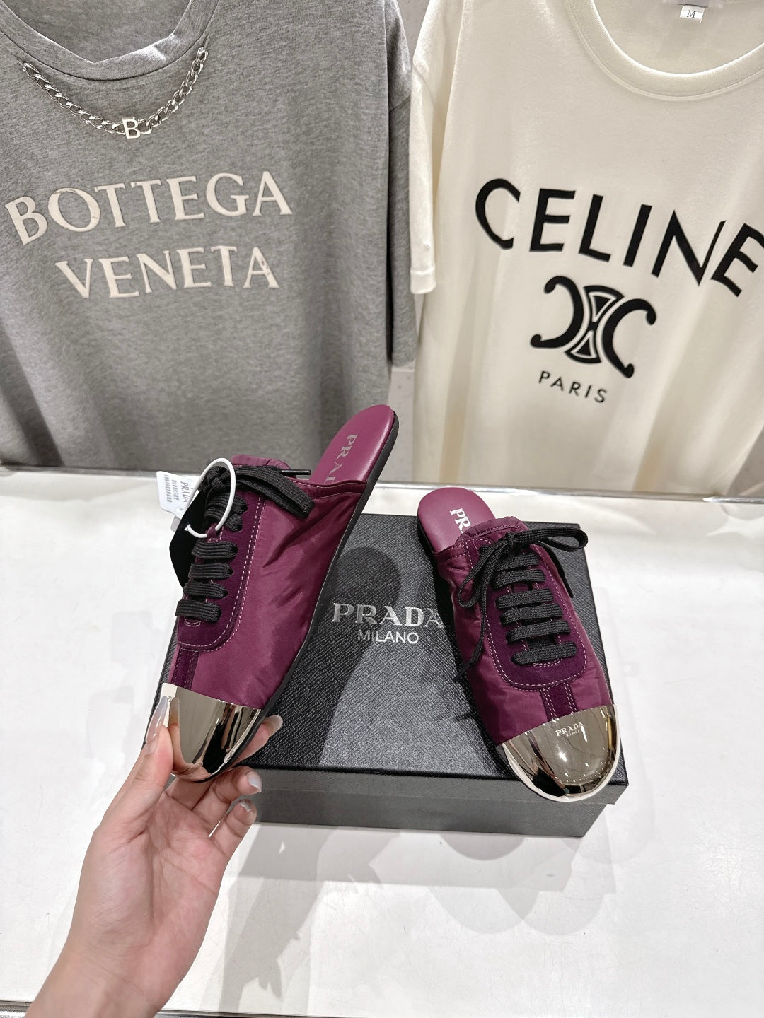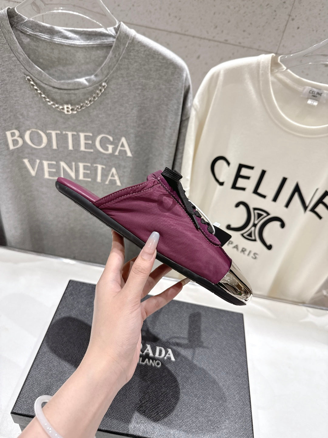 PRADA 25S MULES IN PLUM WITH METAL TOECAP