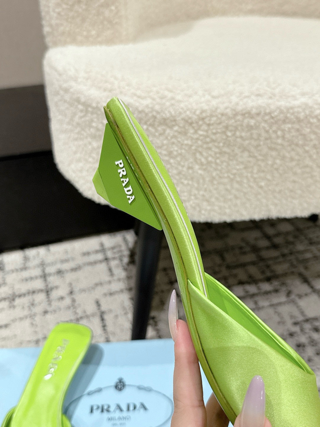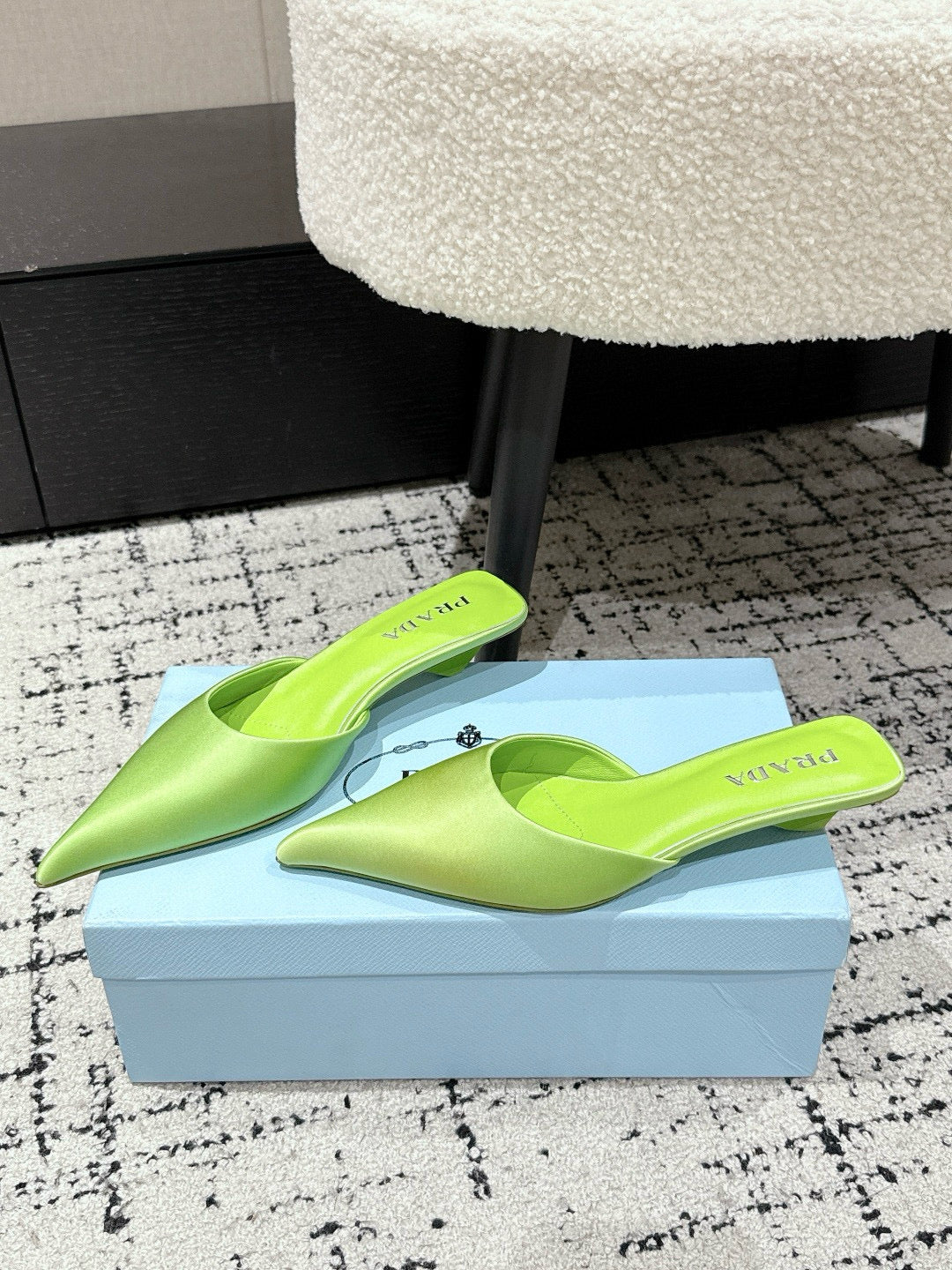 PRADA 25S POINTED-TOE MULES IN LIME GREEN SATIN