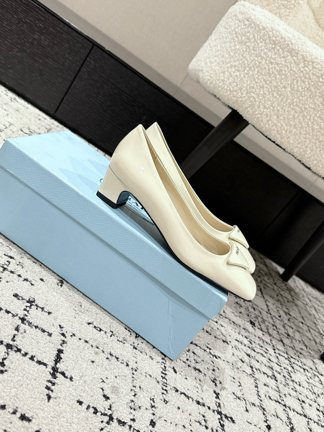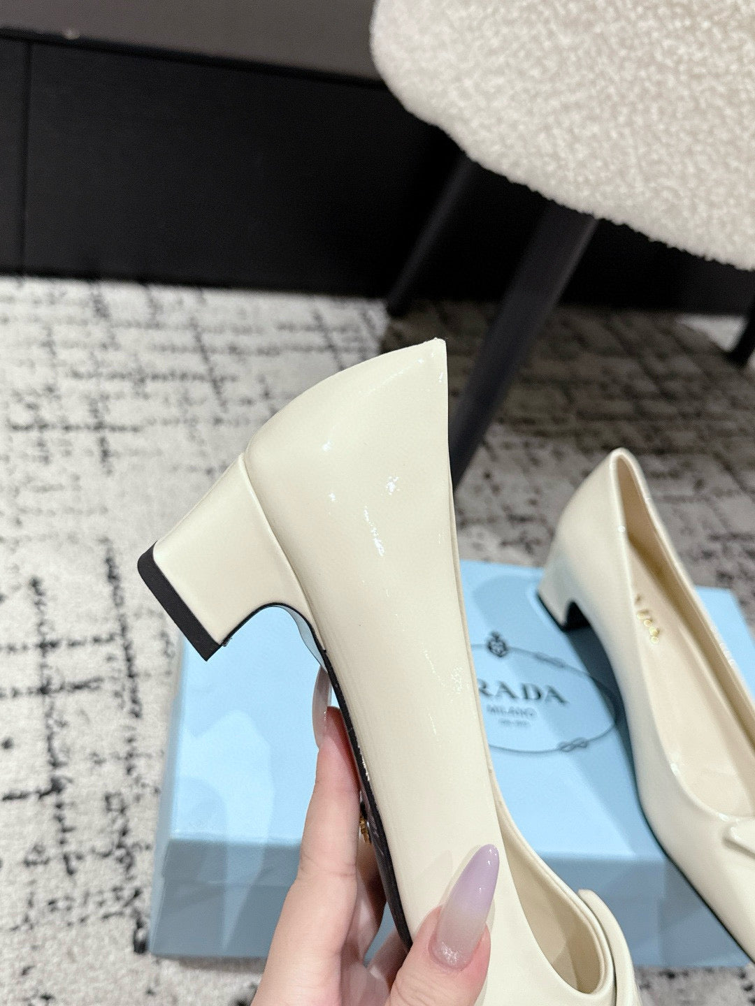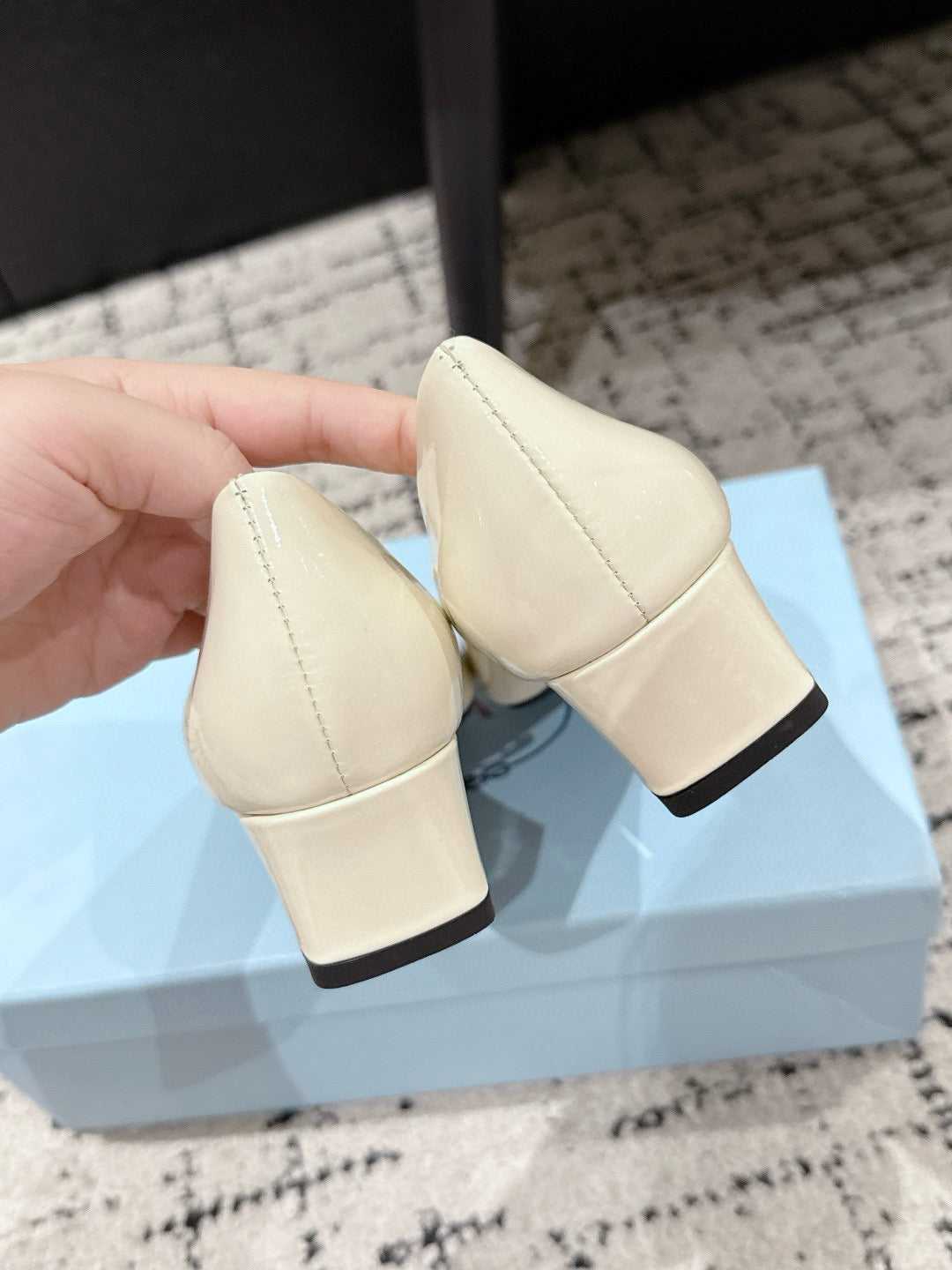 PRADA 25S SQUARE TOE HIGH HEELS IN IVORY GLOSSY CALFSKIN
