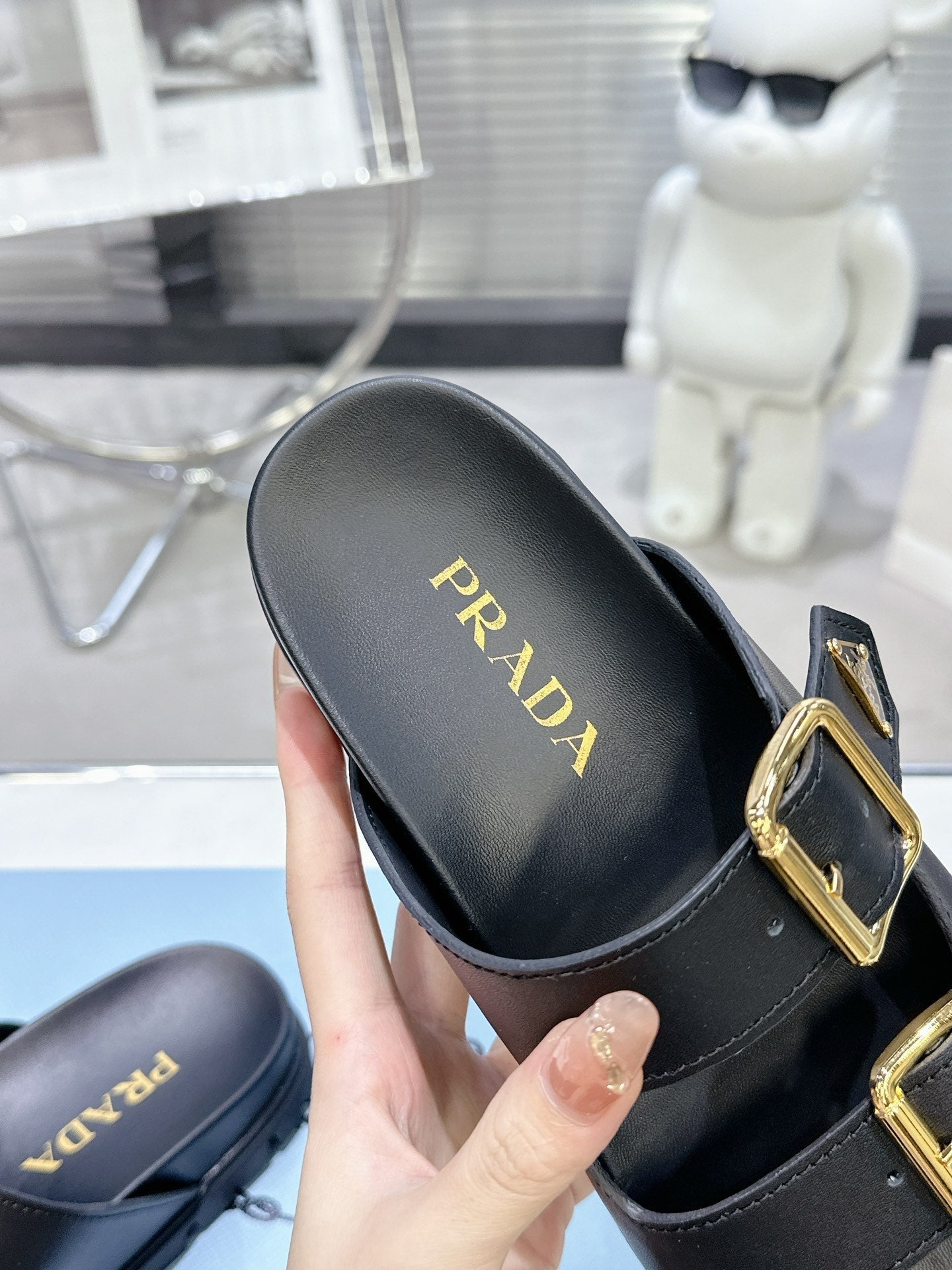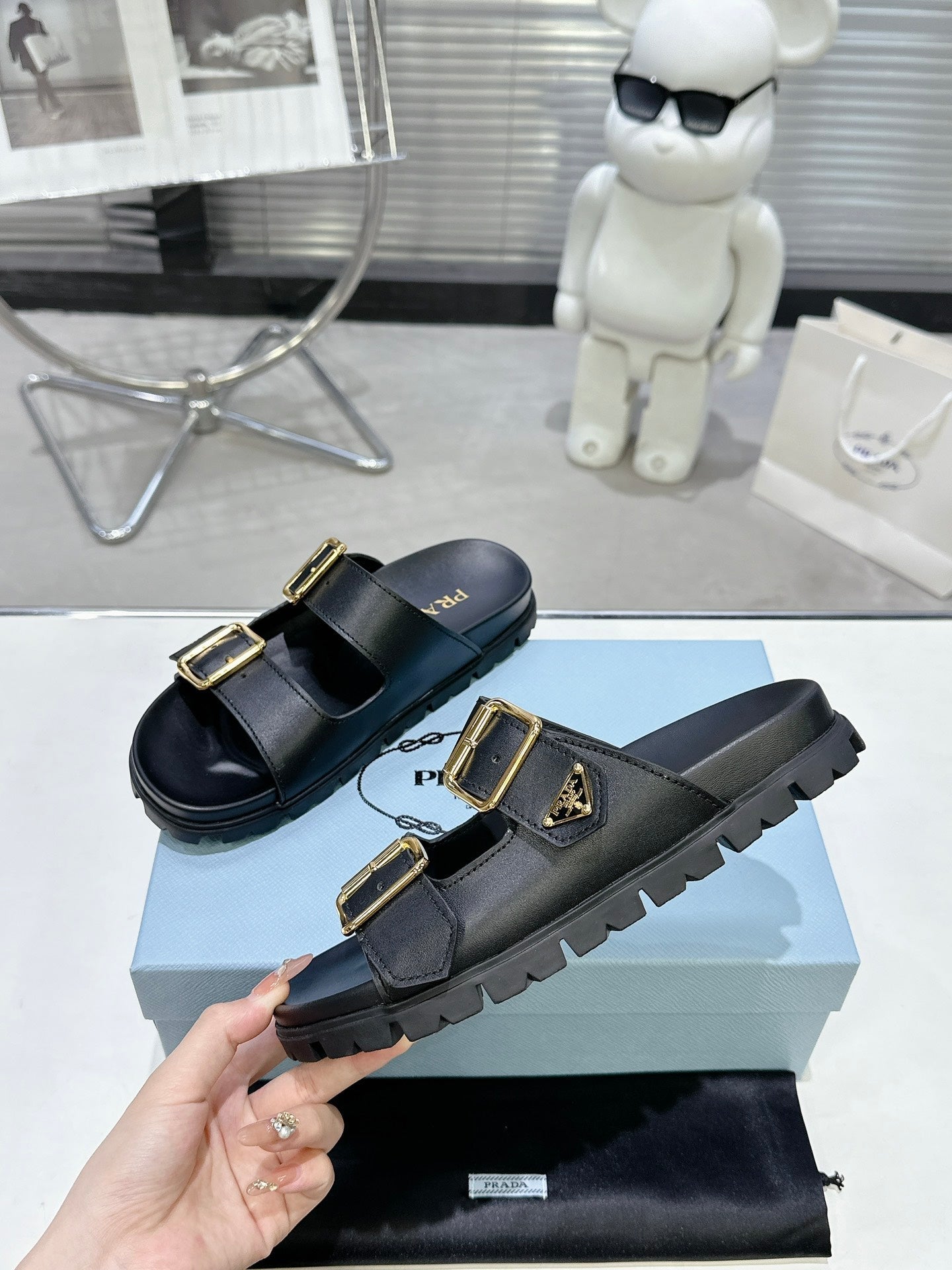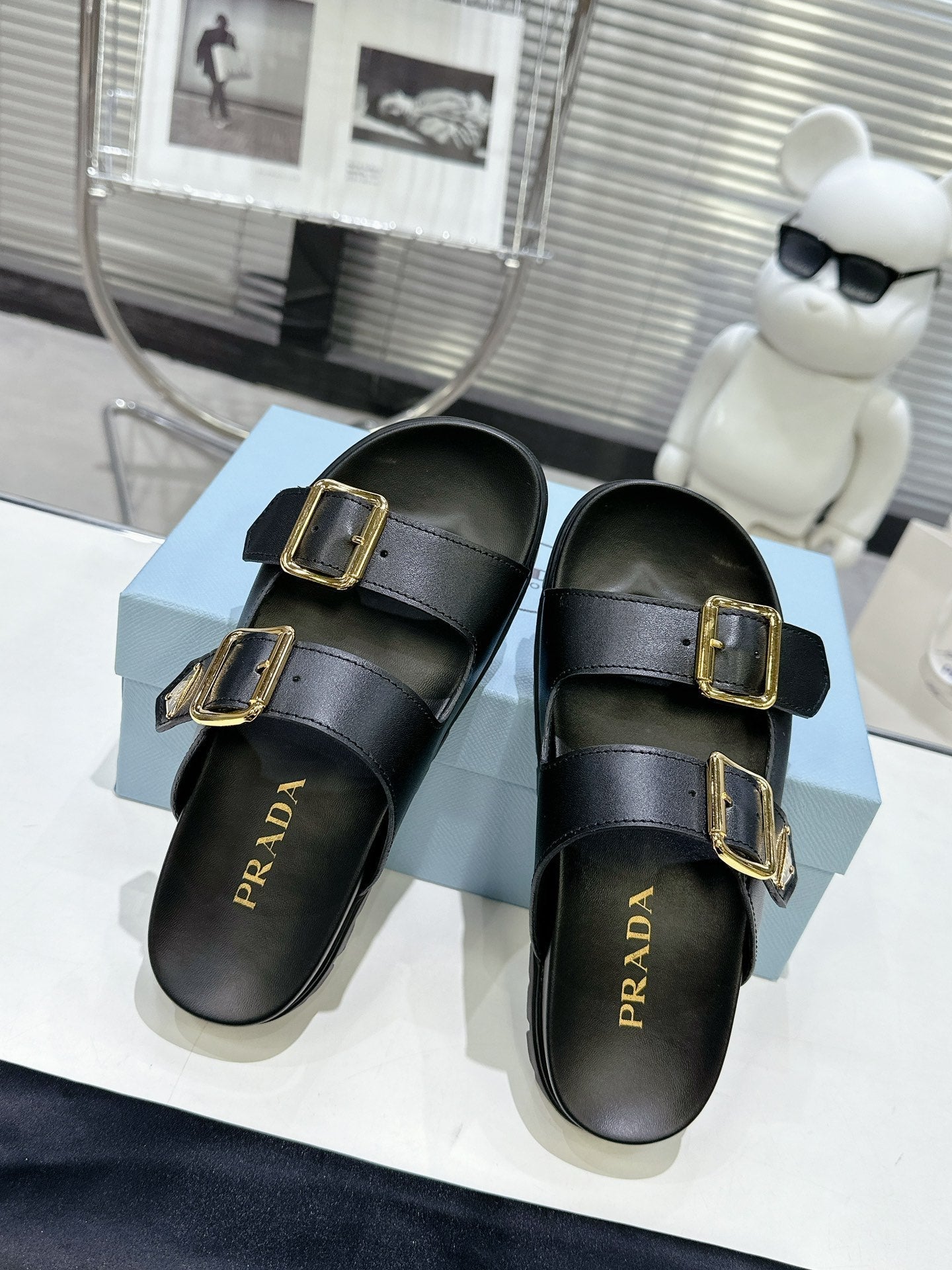 PRADA 25S STRAP SLIDES 30MM IN BLACK CALFSKIN GOLD HARDWARE