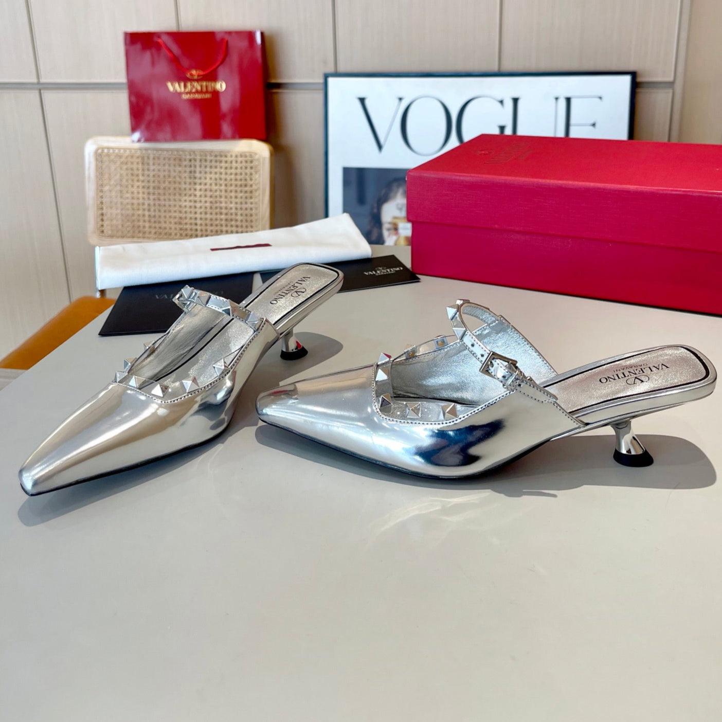 ROCKSTUD CAGED MULES 5 CM IN SILVER CALFSKIN