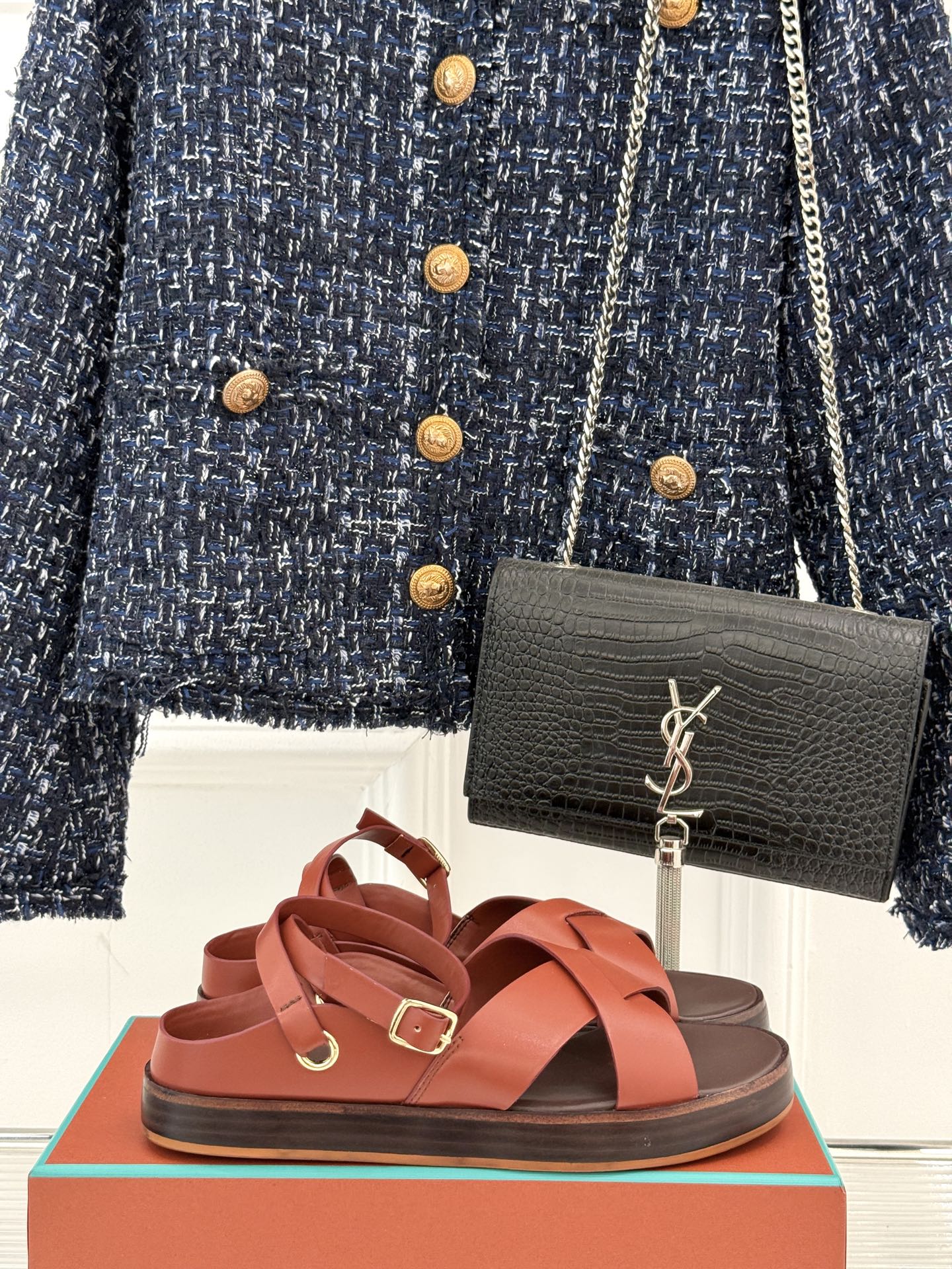 SANDALS THICK SOLE CROSS STRAP IN BURNT ORANGE AND BROWN CALFSKIN