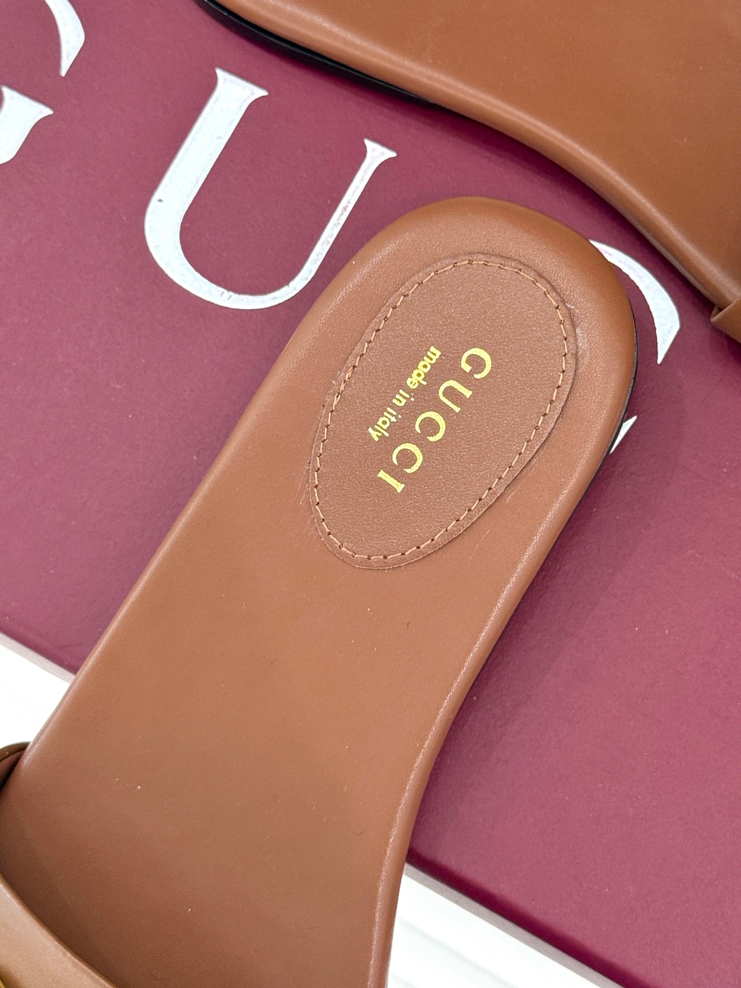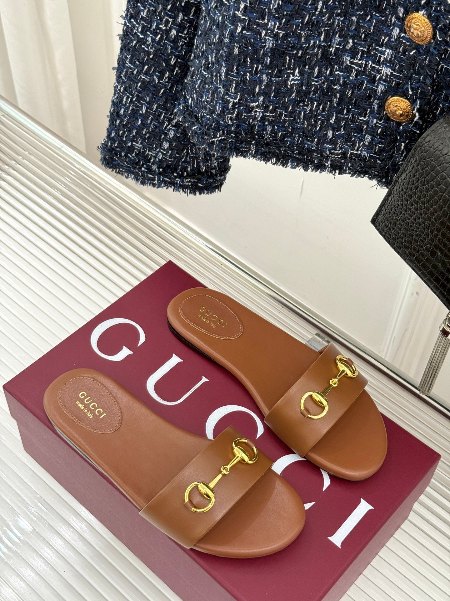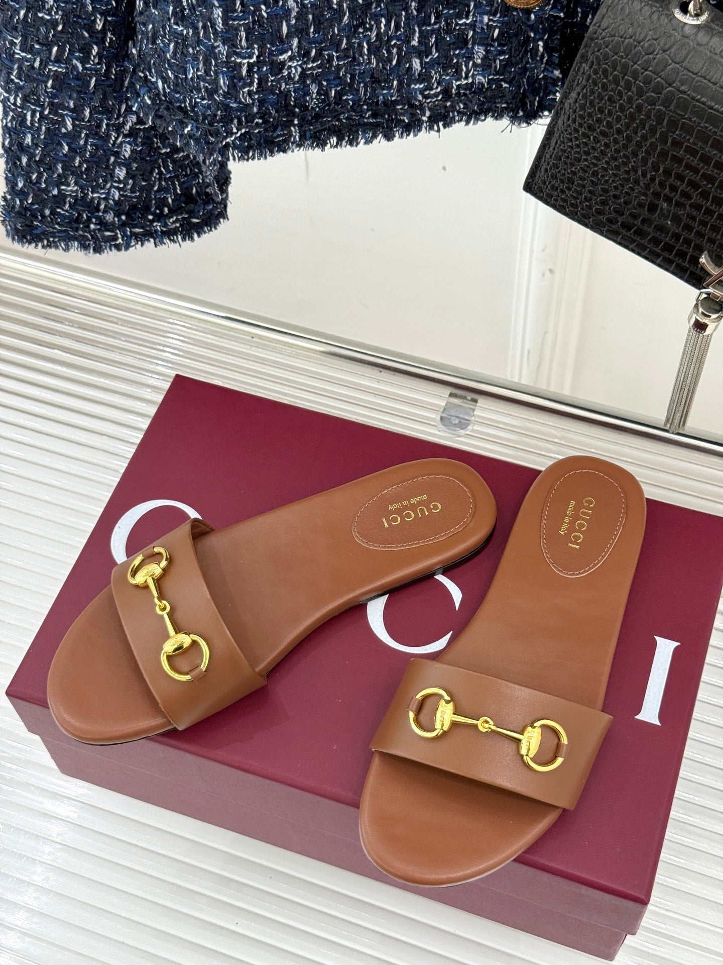 SLIDE SANDALS IN BROWN CALFSKIN WITH GOLD HARDWARE