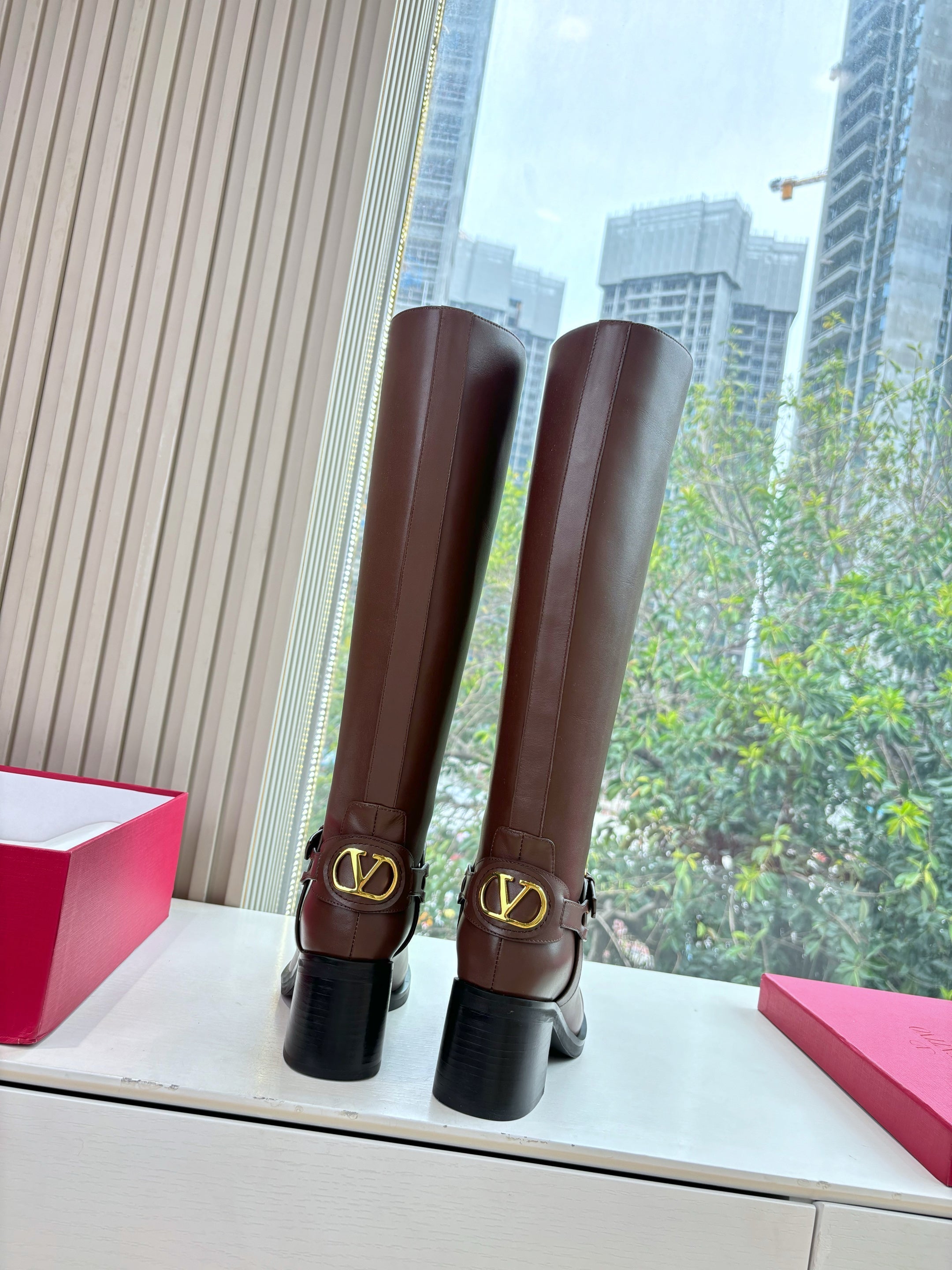 VALENTINO 25S HIGH-CUT SIGNATURE LOGO BOOTS 60 MM IN BROWN CALFSKIN WITH GOLD HARDWARE