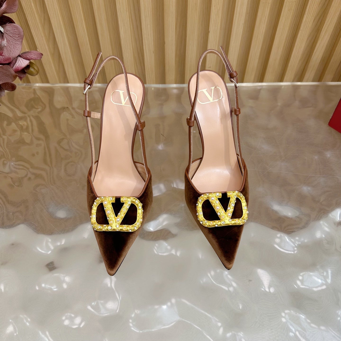 VALENTINO 25S HIGH-HEEL SLINGBACKS IN DARK BROWN VELVET WITH GOLD HARDWARE