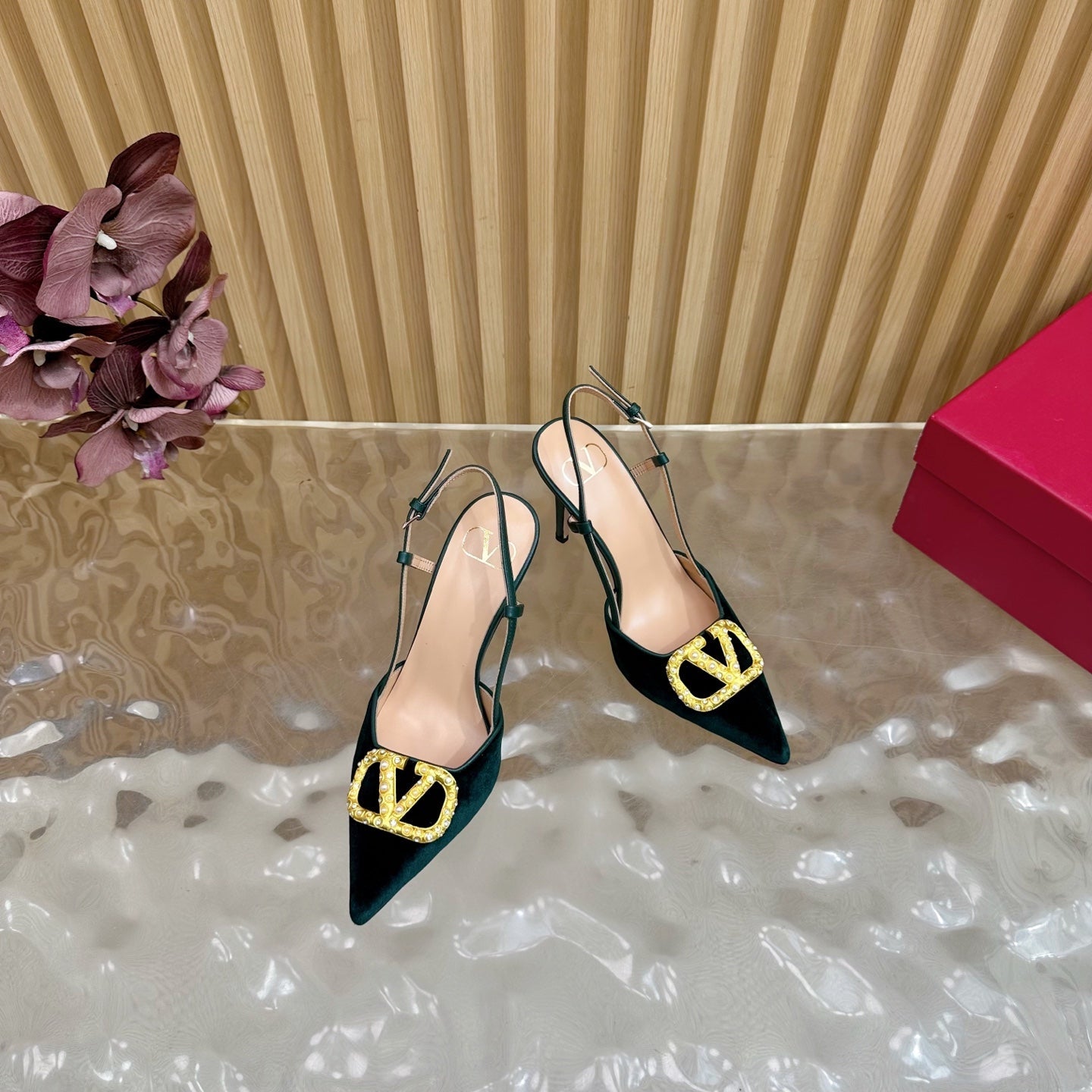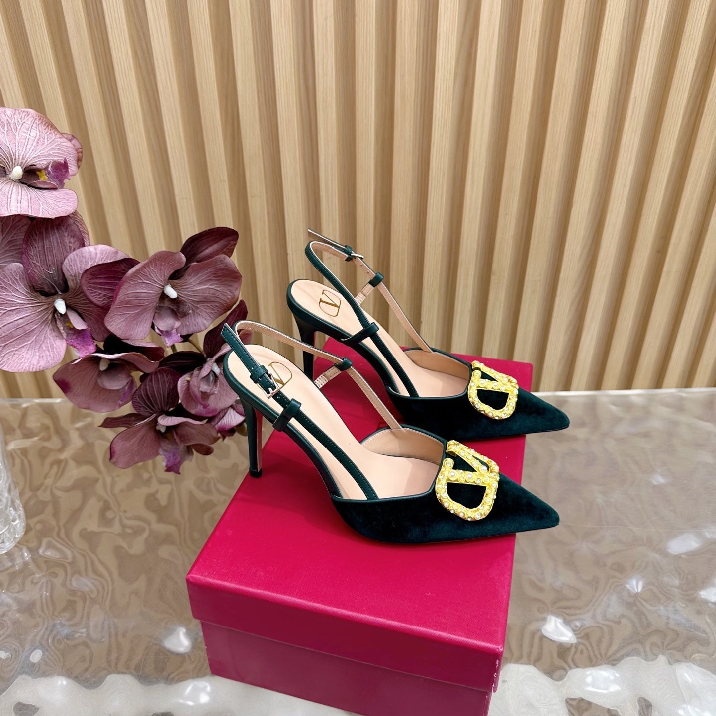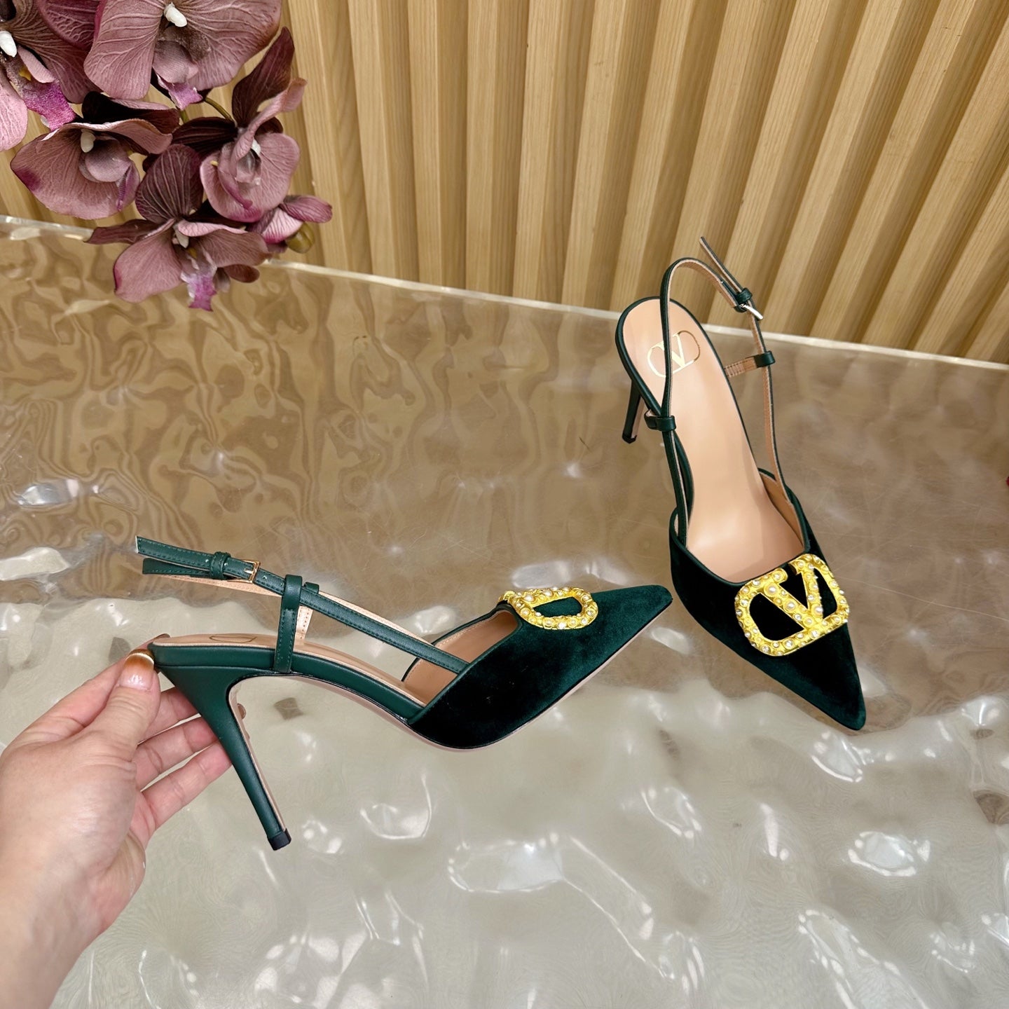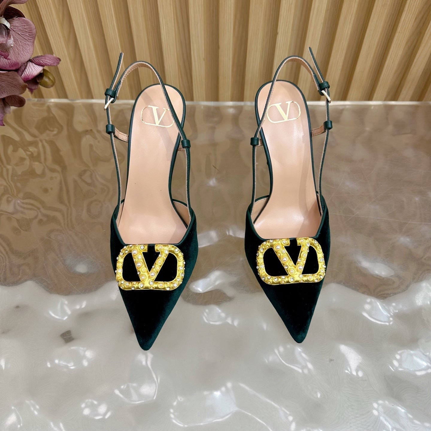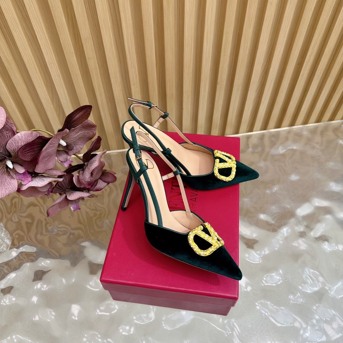 VALENTINO 25S HIGH-HEEL SLINGBACKS IN DARK GREEN VELVET WITH GOLD HARDWARE