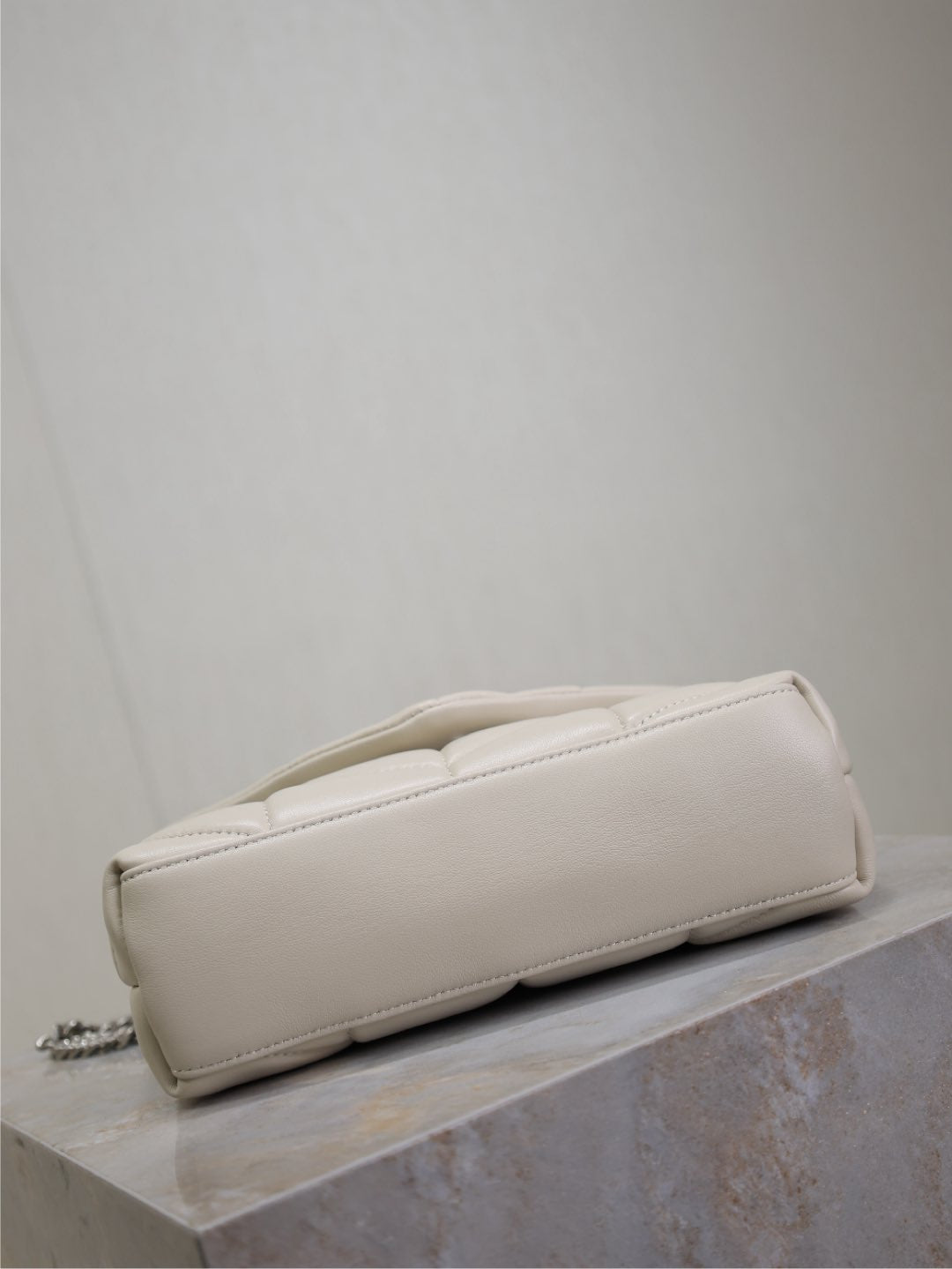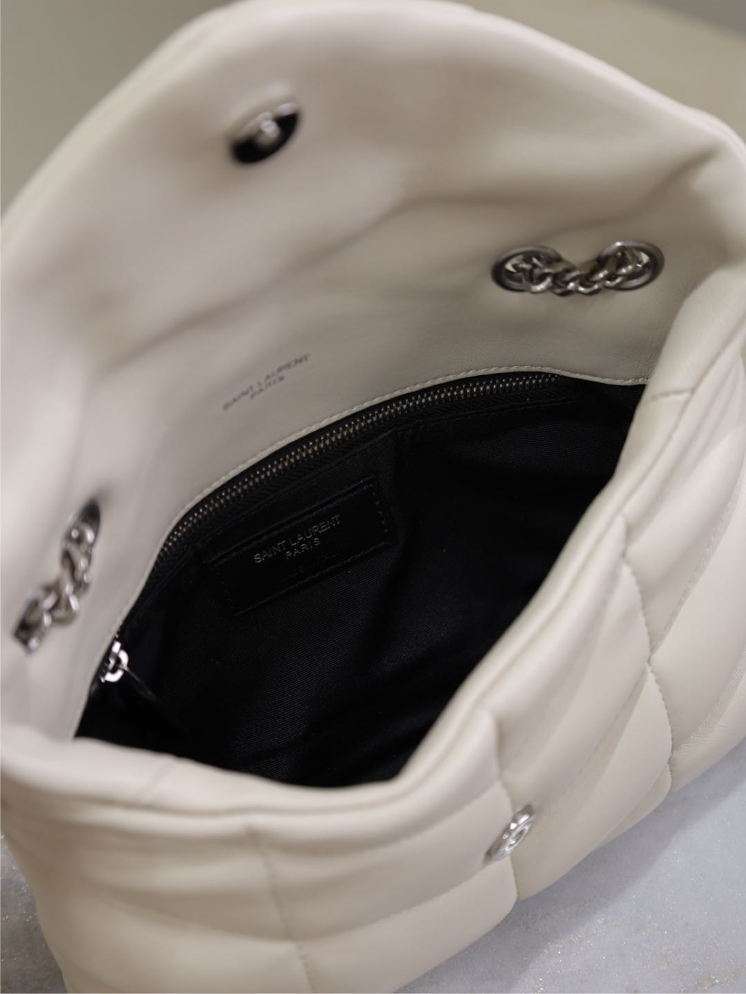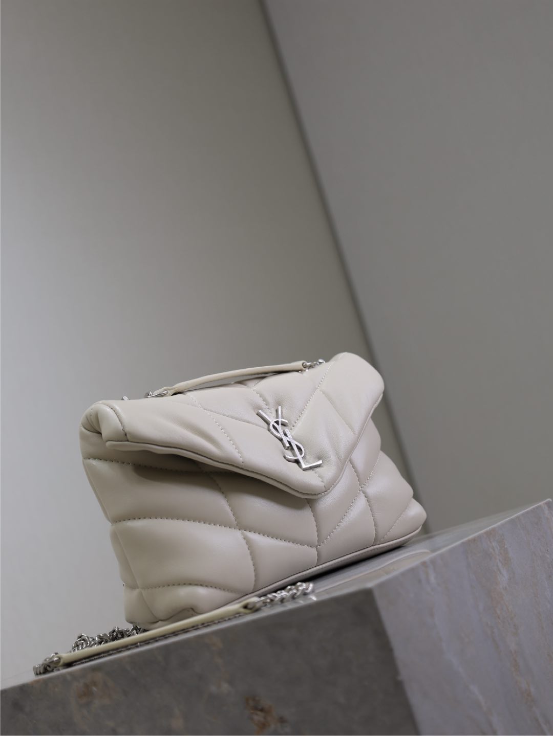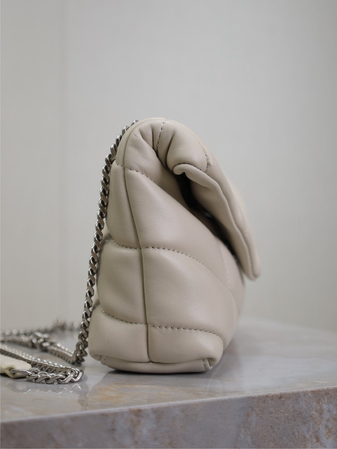 YSL 25S LOULOU PUFFER MINI 23 IN SMOKEY TAUPE CALFSKIN SILVER HARDWARE
